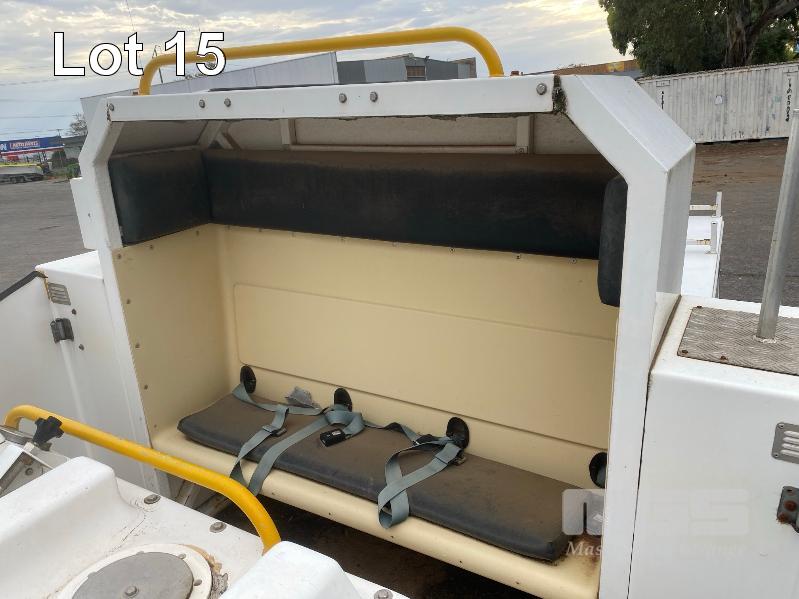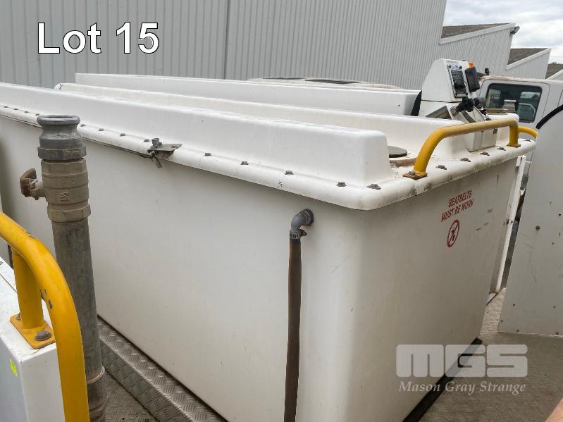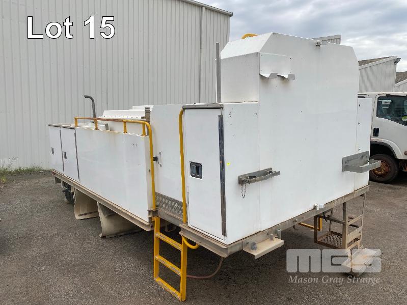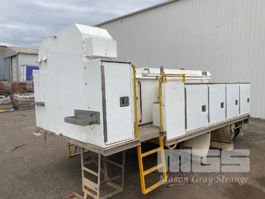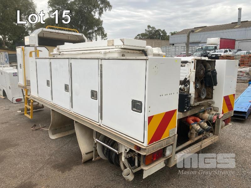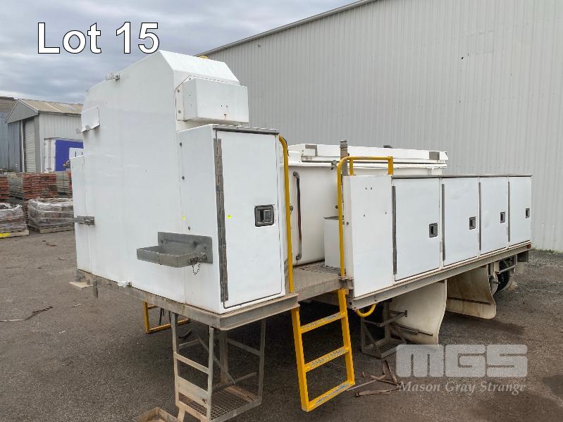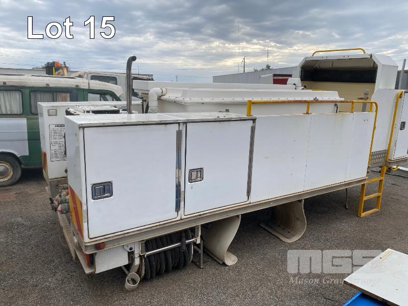 FIRE FIGHTING TRUCK BODY/REAR TANK, PUMP & STORAGE UNITS, MOORE ENGINEERING COMPRISING: GALV STEEL TRAY FITTED WITH FIBREGLASS WATER TANK, SIZE: 2700 x 1200 x 850mm (H) WATER PUMP POWERED BY DEUTZ DIESEL ENGINE HOURS: 450 SHOWING 2 x HOSE REELS, FIRE HOSE MANIFOLDS & COUPLINGS, 8 x FIBREGLASS STORAGE COMPARTMENTS, FRONT MOUNT 3 PERSON SEATING ENCLOSURE, ETC SIZE: 4900 x 2400 x 2450mm (H)