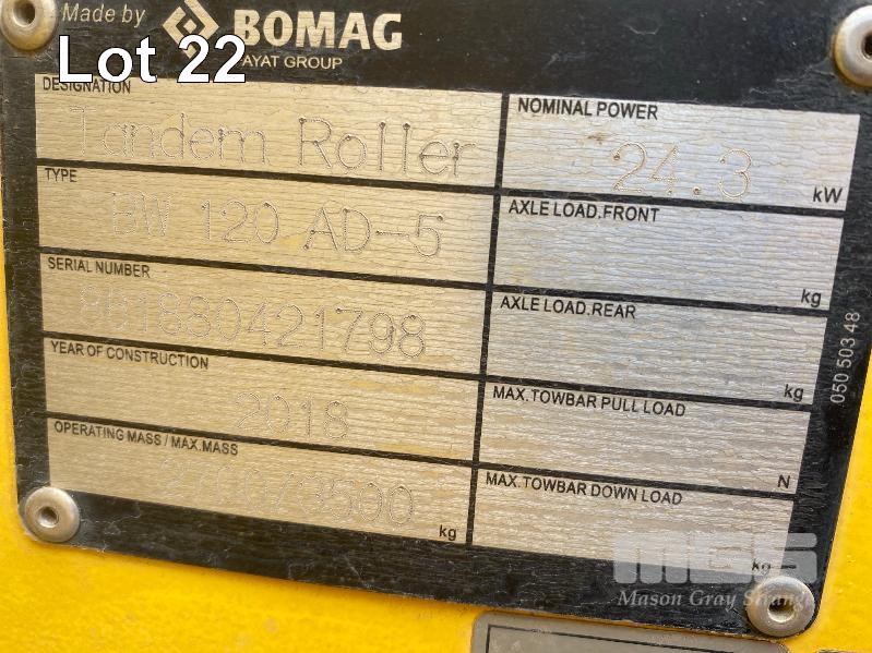 2018 BOMAG TANDEM VIBRATORY ROLLER, TYPE: BW-120ADS S/NO:861880421798 KUBOTA 37kw DIESEL ENGINE MOD: GB20891 ODO: 56 hours SHOWING (METER REPLACED @ 908 HOURS) OPERATING MASS: 2,700kg MAX MASS: 3,500kg (BOOKS IN OFFICE) KEY #27