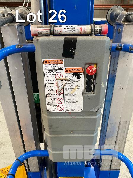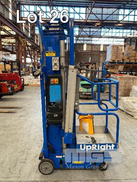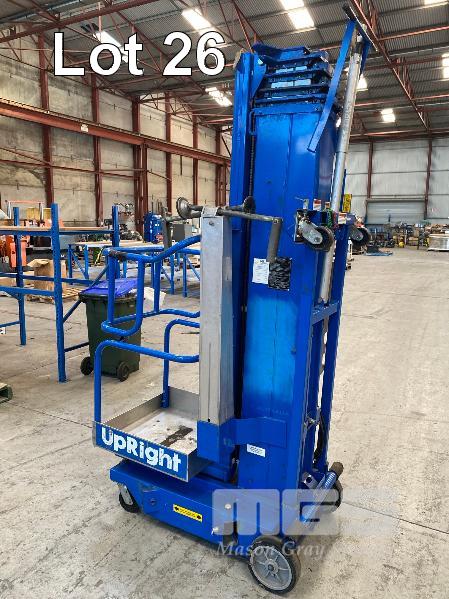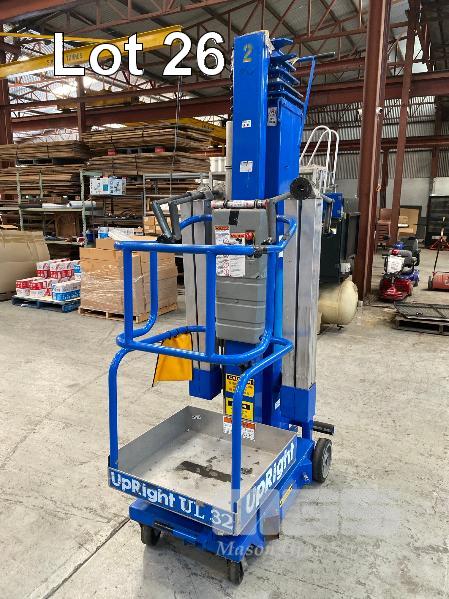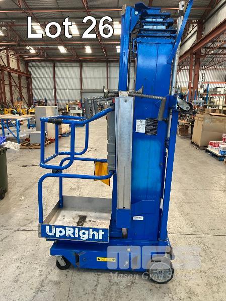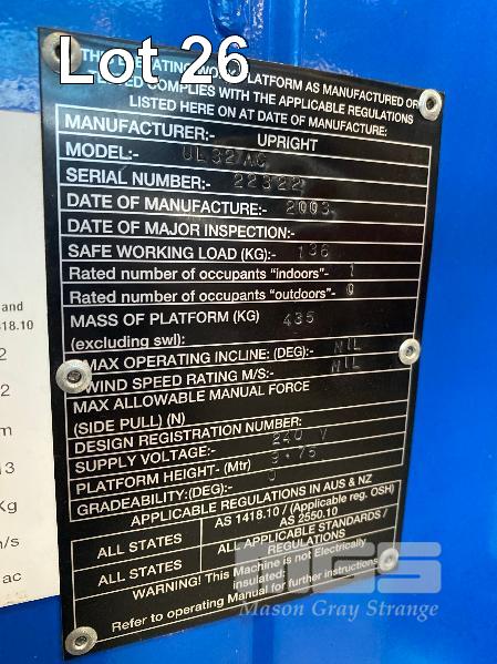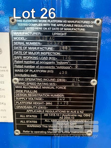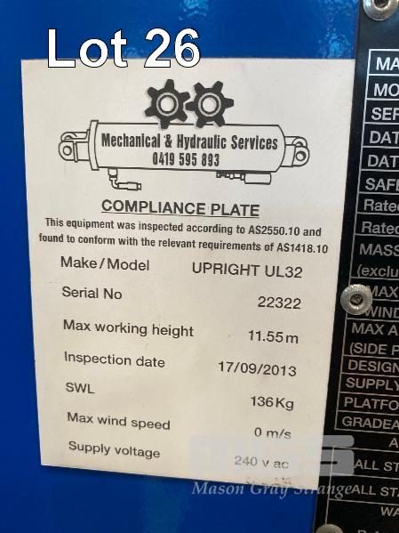 2003 UPRIGHT MOD: UL32AC ELEVATING WORK PLATFORM, TELESCOPIC S/NO: 22322 SAFE WORK LOAD: 136kg (1 PERSON) MAX LIFT HEIGHT: 9,750mm POWER 240V 4 x DETACHABLE STABILIZER LEGS, MOBILE, LAST INSPECTION DATE: 17/9/2013