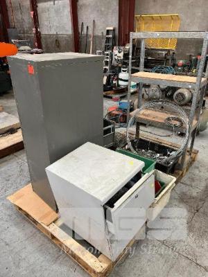 1 x TUB TEK SCREWS, 4 TIER SHELF UNIT, MOBILE TROLLEY, SCREWS, METAL 4 DRAWER FILING CABINET & 2 DRAWER METAL CABINET,