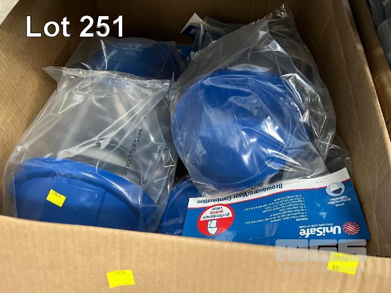 2 x BOXES FACE SHIELDS, 1 x BOX HARD HATS WITH FACE SHIELDS, 10 x BLUE HARD HATS & 6 x BOXES SURGICAL MASKS, 3M
