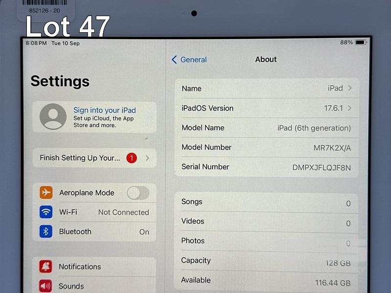 APPLE iPAD 6TH GEN, 128GB, Wi-Fi, SILVER, MODEL MR7K2X/A, A1893 WITH COVER, CABLE & CHARGER S/N:DMPXJFLQJF8N