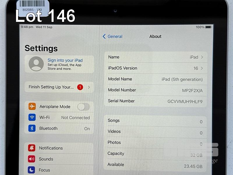 APPLE iPAD 5TH GEN, 32GB, Wi-Fi, SPACE GREY, MODEL MP2F2X/A, A1822 (NO CABLE, NO CHARGER) S/N:GCVVMUH9HLF9
