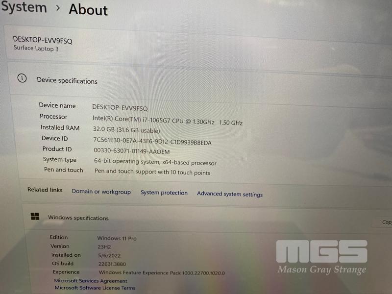LAPTOP, MICROSOFT SURFACE 3, MODEL 1872, CORE i7 1065G7 (10TH GEN) @ 1.3GHz, 32GB DDR4 RAM, 1TB NVMe M.2 SSD, 15" WIDESCREEN (2496x1664), INTEL IRIS PLUS GRAPHICS, Wi-Fi, BLUETOOTH, WINDOWS 11 PRO INSTALLED & POWER SUPPLY S/N:044957602357