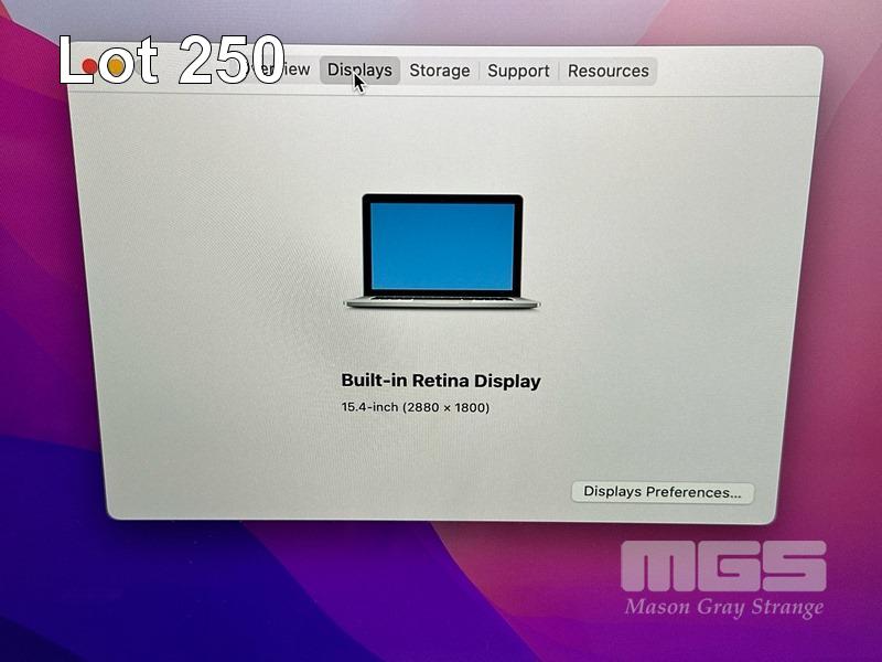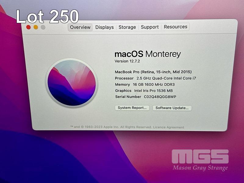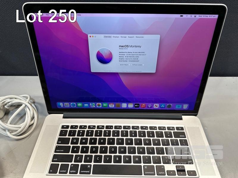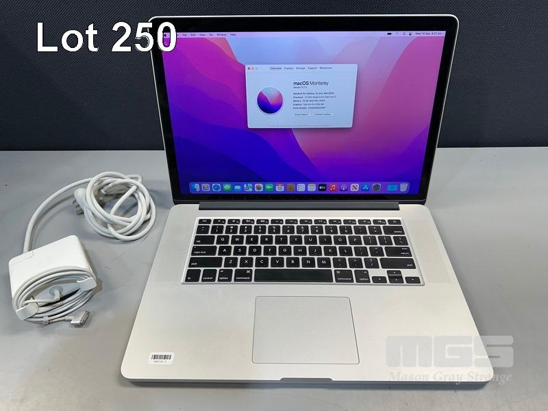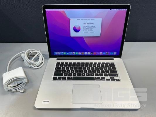 LAPTOP, APPLE MACBOOK PRO (A1398), CORE i7 4870HQ (4TH GEN) @ 2.5GHz, 16GB DDR3 RAM, 512GB SSD, 15.4" RETINA DISPLAY (2880x1800), INTEL IRIS PRO GRAPHICS, Wi-Fi, BLUETOOTH, MAC OS 12 INSTALLED & POWER SUPPLY (NOTE: MINOR MARKS ON SCREEN) S/N:C02Q48QGG8WP