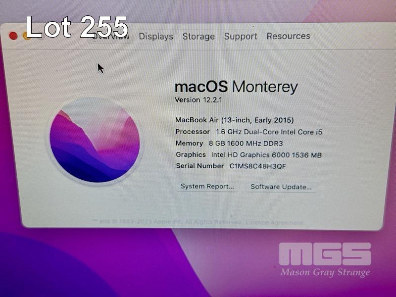 LAPTOP, APPLE MACBOOK AIR (A1466), CORE i5 5250U (5TH GEN) @ 1.6GHz, 8GB DDR3 RAM, 256GB SSD, 13.3" DISPLAY (1440x900), INTEL HD GRAPHICS 6000, Wi-Fi, BLUETOOTH, MAC OS 12 INSTALLED & POWER SUPPLY S/N:C1MS8C48H3QF