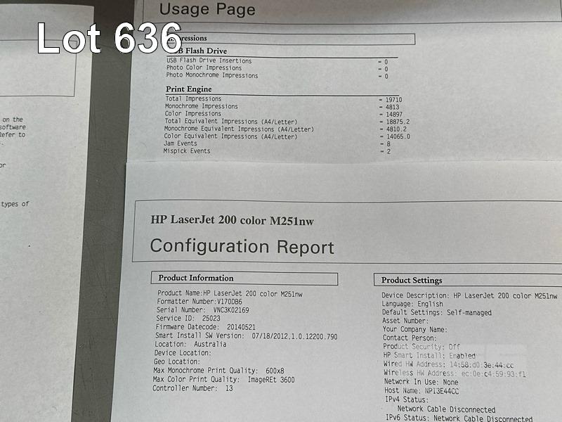 PRINTER, HP LASERJET PRO 200 COLOUR M251nw, USB, NETWORK, WIRELESS, 14,897 COLOUR & 4,813 B&W PAGES (TEST PAGE ATTACHED) S/N:VNC3K02169
