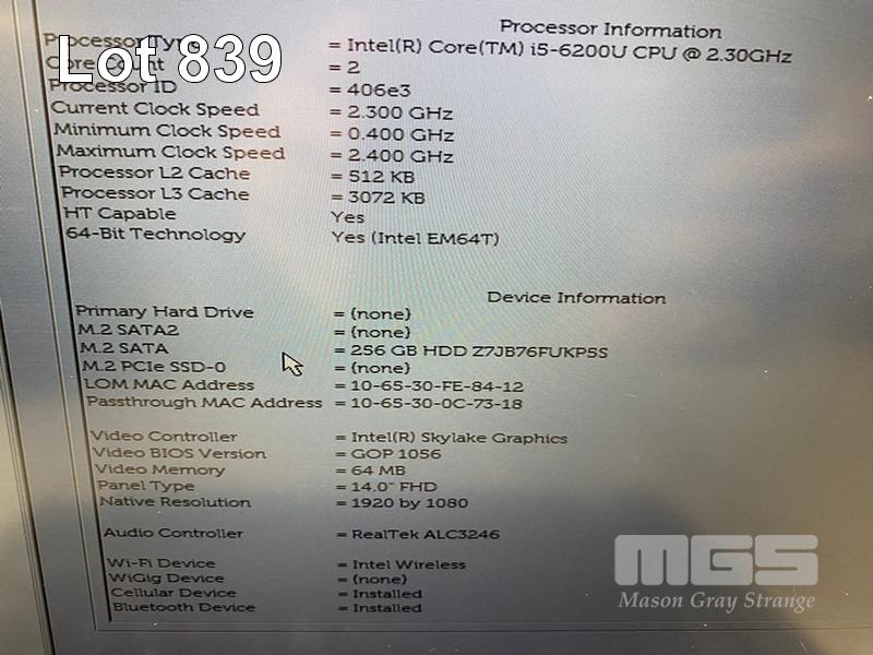 LAPTOP, DELL LATITUDE 5480, CORE i5 6200U (6TH GEN) @ 2.3GHz, 8GB DDR4 RAM, 256GB M.2 SSD, 14" WIDESCREEN (1920x1080), INTEL HD GRAPHICS 520, Wi-Fi, CELLULAR, BLUETOOTH, WINDOWS 10 PRO INSTALLED (NO POWER SUPPLY) (NOTE: BATTERY NOT HOLDING CHARGE, MARKS ON SCREEN) S/N:5TDVZM2
