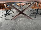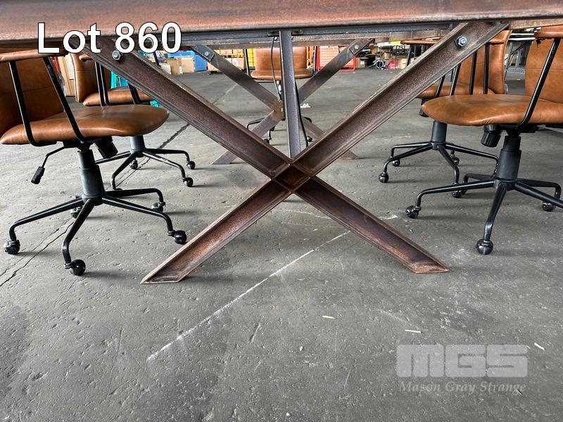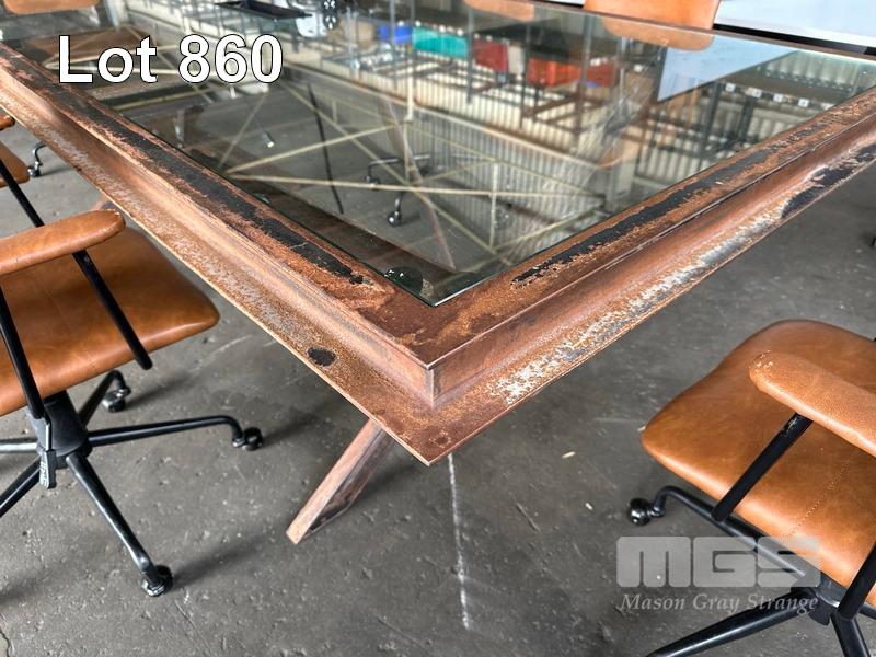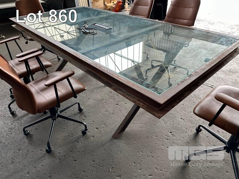 BOARDROOM TABLE, HEAVY DUTY RUSTIC STEEL FRAME, GLASS TOP WITH POWER INSERT, 250 x 120cm WITH 6 x FREEDOM OREN OFFICE CHAIRS, TAN LEATHER LOOK (NOTE: SOME ARMS WORN)