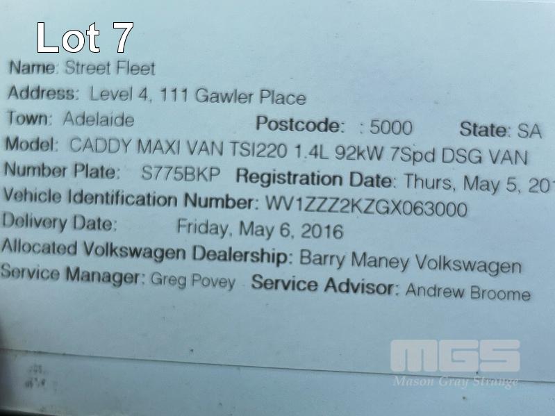 2016 VOLKSWAGON CADDY TSI VAN REG: S775 BKP (SA) VIN: WV1ZZZ2KZGX063000 ODO: 261,793kms SHOWING 4 CYLINDER PETROL, AUTOMATIC TRANSMISSION, WHITE DUCO, 5 DOORS, 2 SEAT, LIGHT BAR, ROOF VENT BARN DOORS ON REAR KEY #5 (WITH 2 KEY/S)