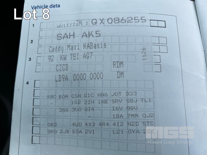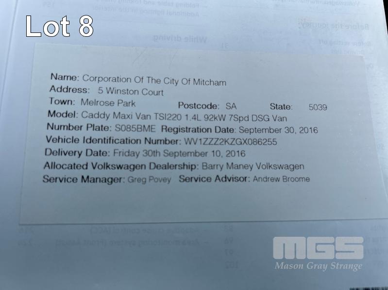 2016 VOLKSWAGEN CADDY VAN REG: S085 BME (SA) VIN: WV1ZZZZKZGXD86255 ODO: 259,876kms SHOWING 4 CYLINDER PETROL, AUTOMATIC TRANSMISSION, 5 DOORS, 2 SEAT, AIR BAG, AIR CON, BLUETOOTH, CENTRAL LOCKING, CRUISE CONTROL, POWER WINDOWS, SPARE WHEEL, BARN DOORS ON REAR, ROOF VENT KEY #6 (WITH 1 KEY/S) CONDITION: LEFT SIDE - DAMAGE LEFT HEADLIGHT - BROKEN CONDITION - POOR