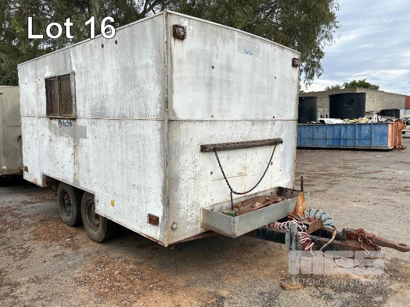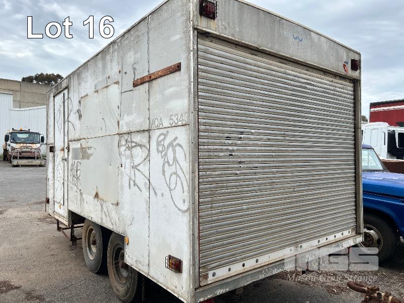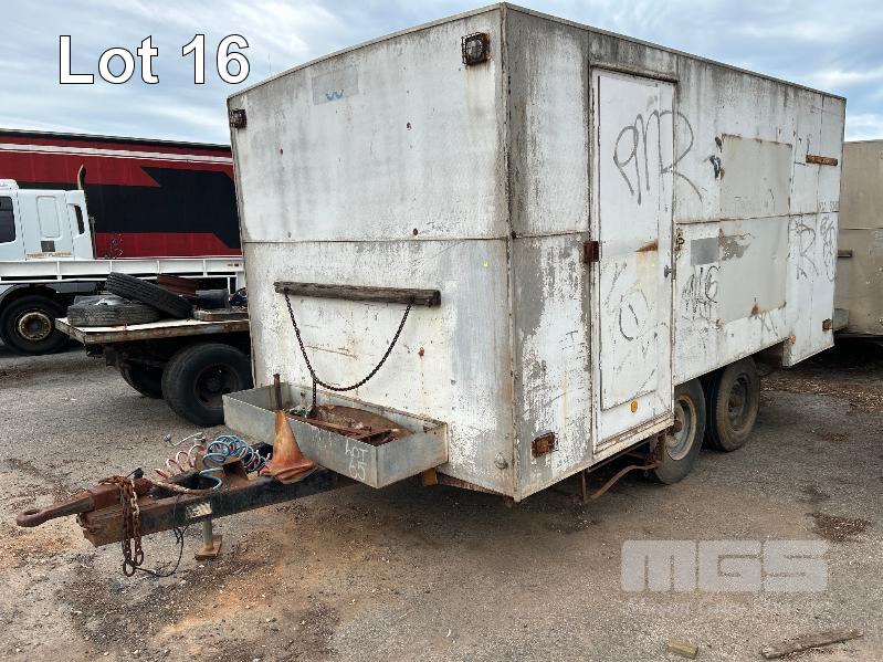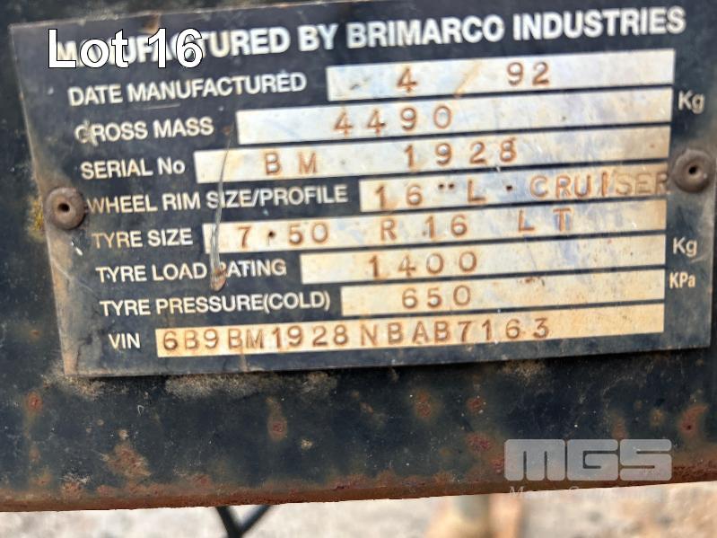 1992 BRIMARCO IND. ENCLOSED TRAILER/CARAVAN, TANDEM AXLE, MOBILE WORKSHOP/STORAGE REG: TDC 524 (SA) VIN: 6B9BM192NBAB7163 SIZE : 4410 x 2410 x 2670mm (H) FULLY ENCLOSED ALLOY CLAD BODY WITH REAR ROLLER DOOR, 1 x WINDOW & ROOF MOUNT POP UP VENT, BUILT IN SHELVING & RACKING, WORK BENCH & SEATING RING FEEDER HITCH, AIR BRAKES TYRE SIZE: 7.50R16LT GVM: 4,490kg