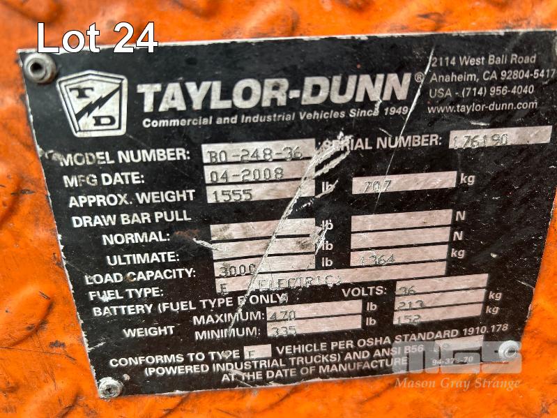 2008 TAYLOR DUNN INDUSTRIAL ELECTRIC UTILITY VEHICLE, BIG FOOT MOD: BO-248-36 S/NO: 176190 2 PERSON WITH TRAY BACK LOAD CAP: 3,000kg FITTED WITH FORK TRACK SAFETY MANAGEMENT SYSTEM TRAY SIZE: 2000 x 1000mm PIN TOW HITCH (NOT INCLUDING CHARGER) NO KEY