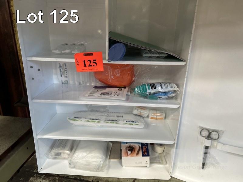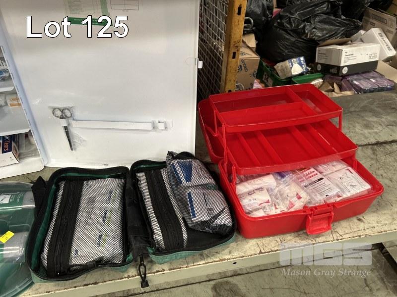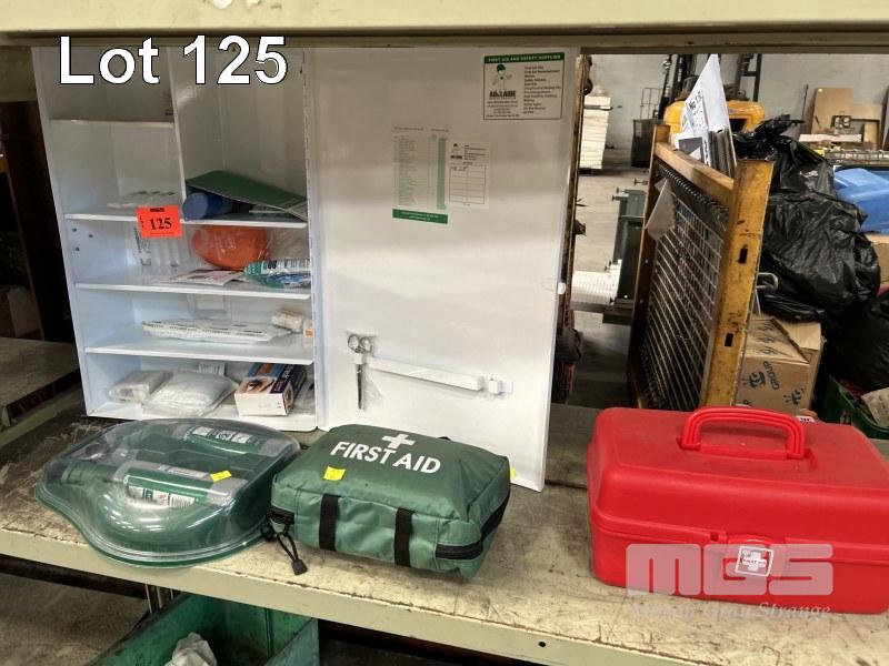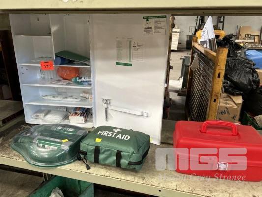 METAL FIRST AID CABINET & CONTENTS, EYE WASH KIT WITH 2 x FIELD KITS