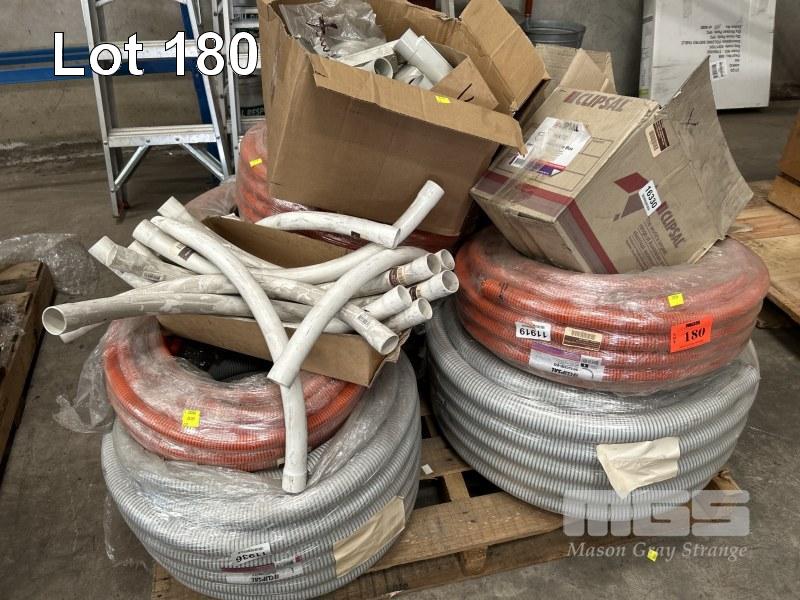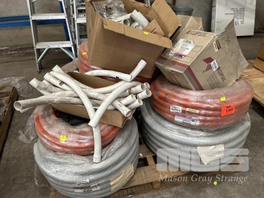 ELECTRICAL CONDUIT, FLEXIBLE, CLIPSAL 4 x ROLLS 50mm MEDIUM DUTY, GREY & 5 x ROLL 25mm ORANGE WITH ASSORTED PVC PIPE FITTINGS, JOINERS, BENDS, CLIPS, ETC 1 x PALLET