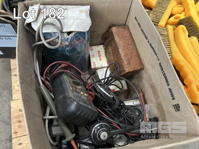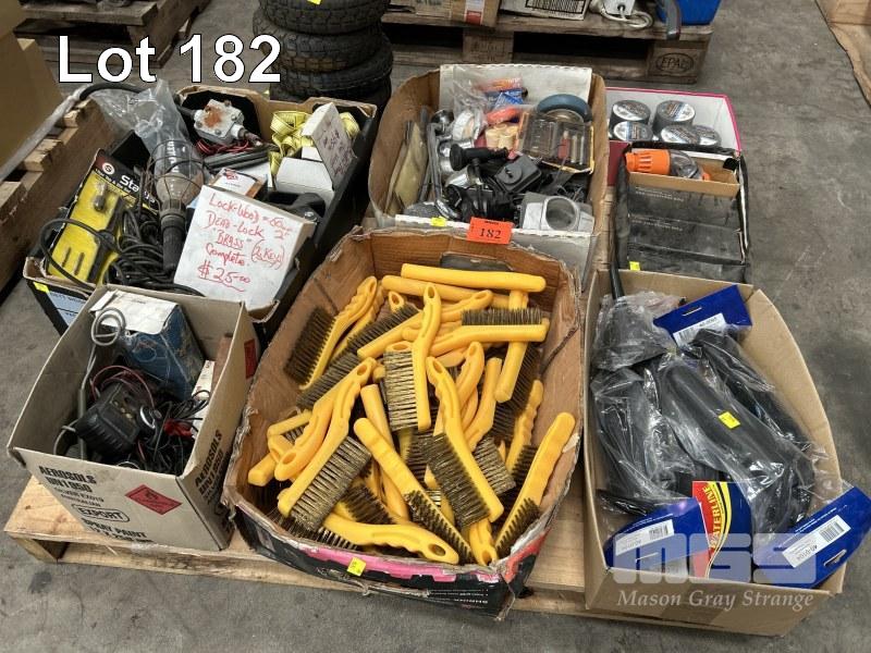 ASSORTED HAND TOOLS & HARDWARE INCLUDING BRASS WIRE BRUSHES, MULTI METERS & ELEC TESTERS, TAP & DIE SET, PUMP, ELEC TAPE, ROD HOLDERS, SACK TRUCK TYRES, ETC 1 x PALLET