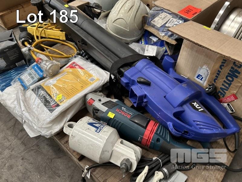 ASSORTED HARDWARE, TOOLS & ELECTRONICS INC XU1 BLOWER VAC, BOSCH GWS 24 ANGLE GRINDER, FLEXIBLE STAINLESS STEEL PIPE JOINER, BANDSAW BLADES, FUSES, SWITCHES, ETC 1 x PALLET