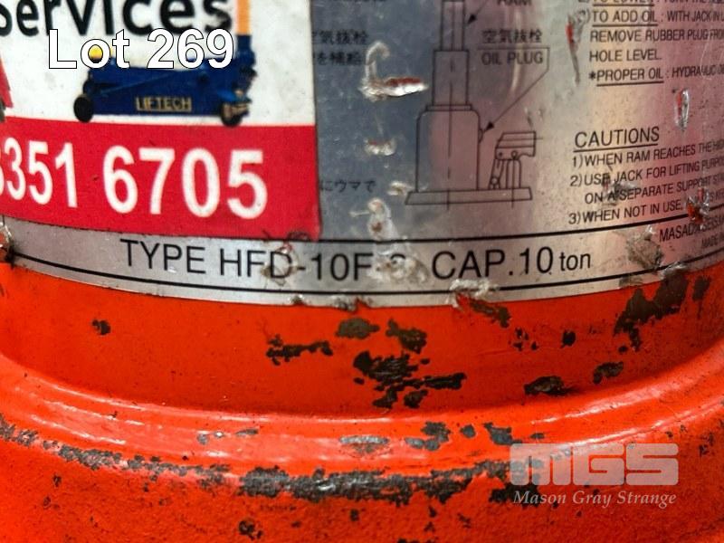 2 x HYDRAULIC BOTTLE JACKS, MASADA INC. HFD 10F3 , 2 STAGE, 10 TON & SINGLE STAGE 20T