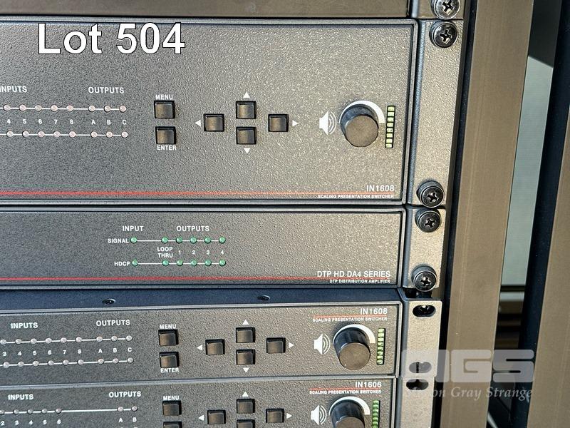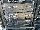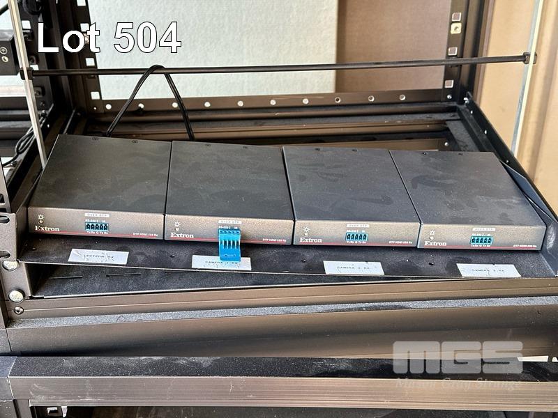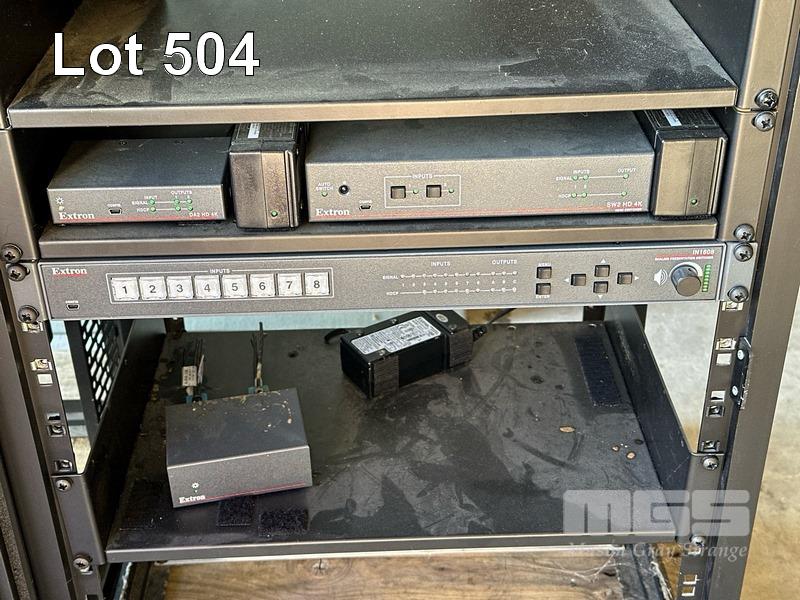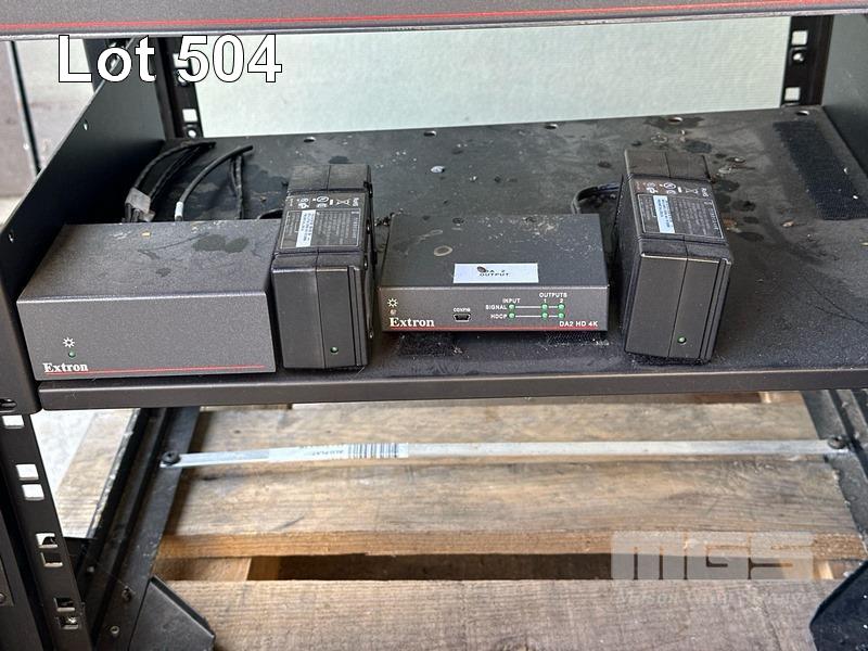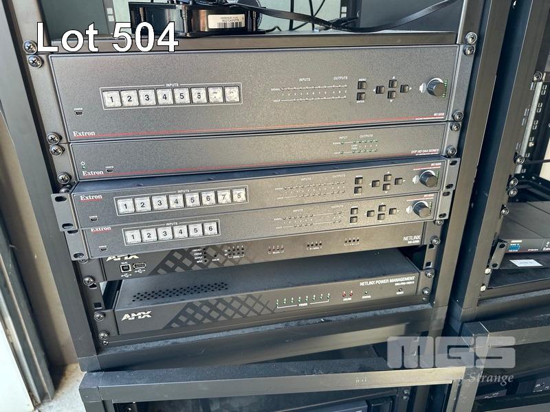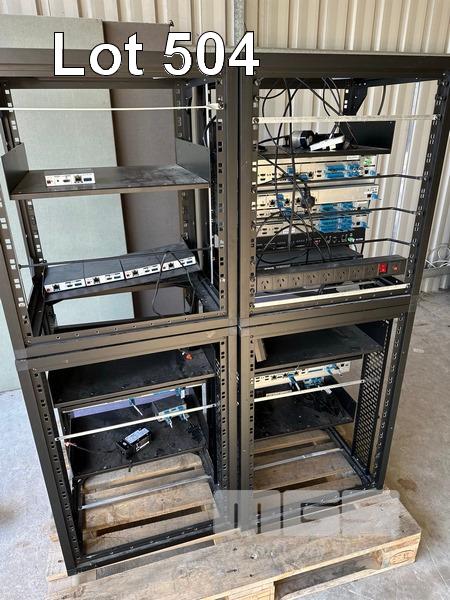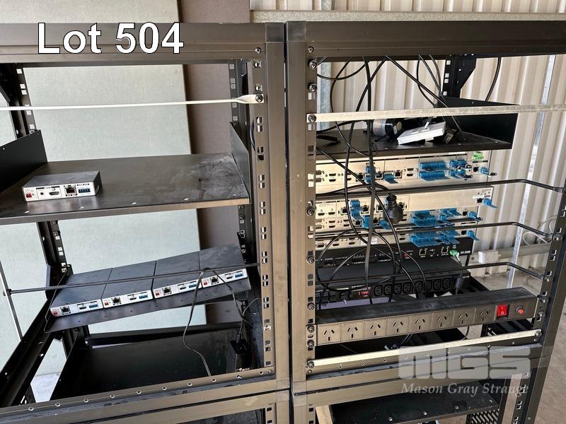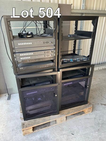 2 x DATA RACK FRAMES, 12RU 2 x DATA RACK FRAMES, 15RU WITH DOORS (NO KEYS) WITH CONTENTS INC. AMX & EXTRON EQUIPMENT, POWERBOARDS