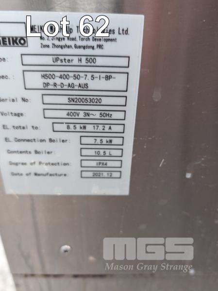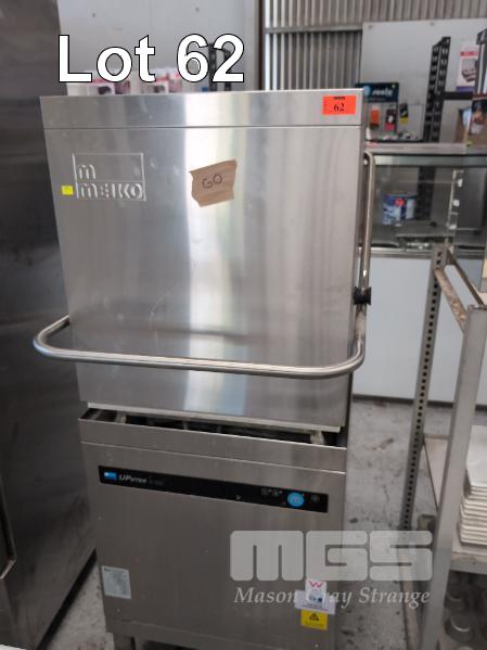 1 X MEIKO UPSTER H500 PASSTHROUGH DISHWASHER. 2 X TRAY RACKS. 690 X 850 X 1,500 - 2,000 MM (W D H). 415V.