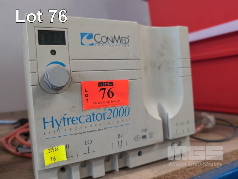 CONMED HYFRECATOR 2000 ELECTROSURGICAL UNIT, MOD: 7-900-230, SERIAL: 07JGJ375, 240V 10AMP PLUG WITH BOOKLET & ACCESSORIES