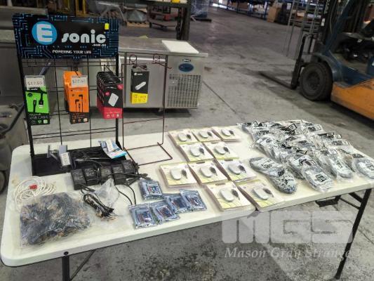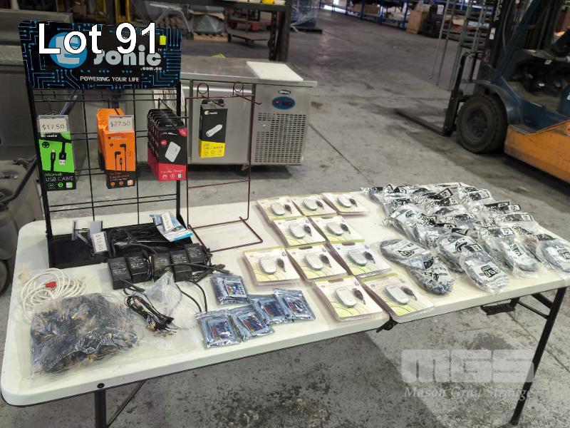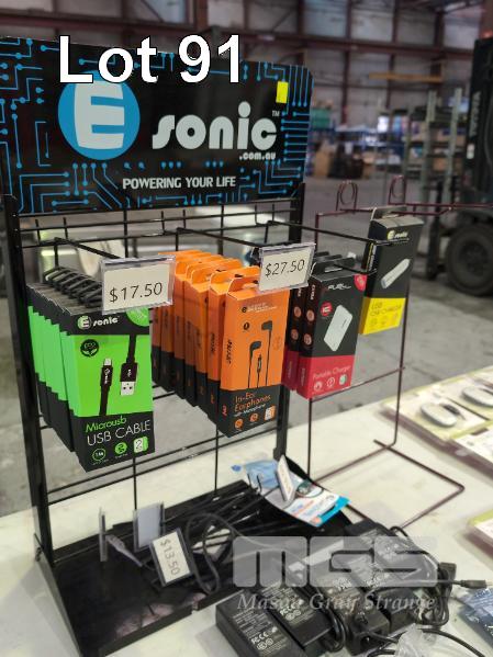 ASSORTED NEW RETAIL ELECTRONIC ACCESSORIES WITH 2 X COUNTER TOP DISPLAY STANDS. ETC.