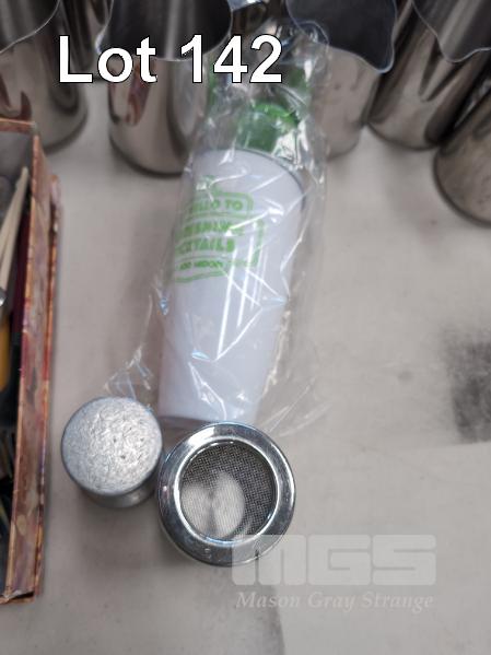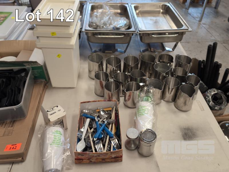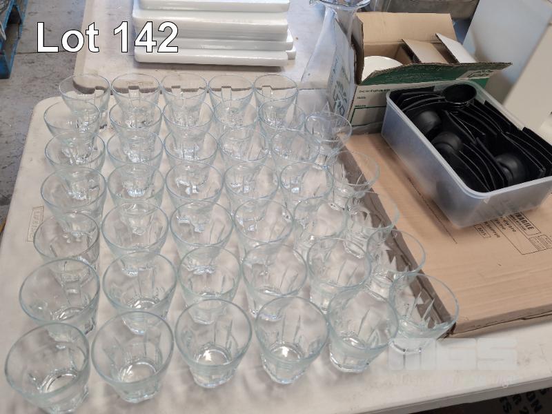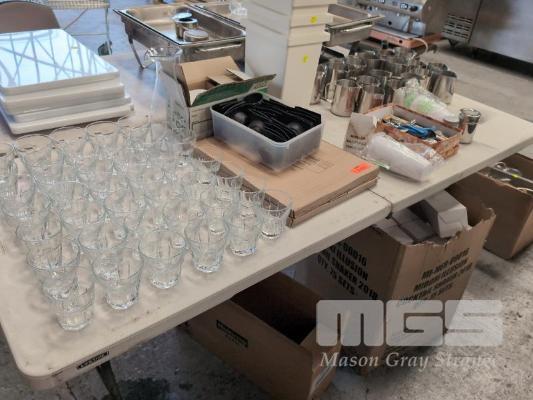 ASSORTED GLASSES, CUTLERY, CROCKERY, MILK JUGS, FRIAND CASES, MIDORI SHAKERS ETC. CONTENTS 1 X TABLE AND 1 X CARTON.