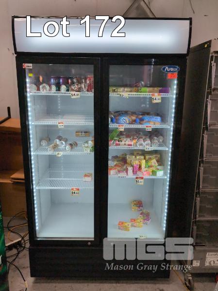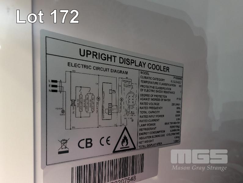 1 X 2-DOOR RETAIL UPRIGHT DISPLAY FRIDGE. ILLUMINATED. MODEL P1000WB. 1,130 X 720 X 2,000 MM (W D H). 240V.