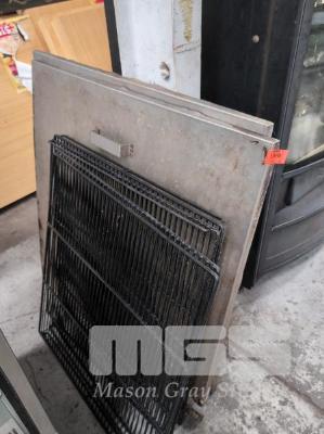 2 X STAINLESS STEEL COVER LIDS WITH HANDLES. SQUARE. 1,130 MM SIDES. 4 X COATED WIRE SHELVES. 780 X 820 MM.