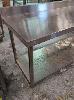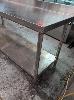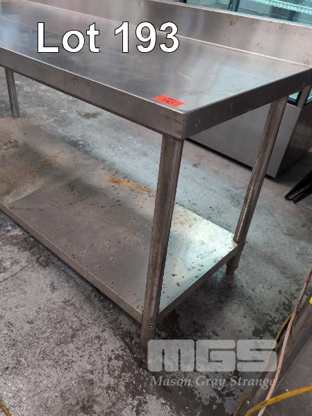 1 X BUTCHER'S STAINLESS STEEL PROCESS/ CHOPPING BENCH WITH SPLASHBACK AND UNDER SHELF. 1,800 X 700 X 850 MM (W D H). ** RUST SPOTS ON UNDER SHELF && TWO FEET MISSING **