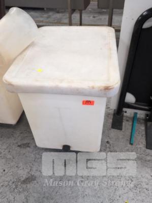 1 X MOBILE 230 LITRE (EST.) FOOD GRADE PLASTIC RECTANGULAR TUB. WITH DRAIN PLUG & LID. 700 X 550 X 750 MM (OVERALL W D H).