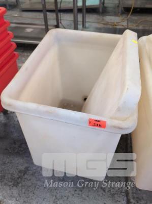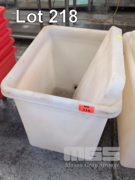 1 X MOBILE 230 LITRE (EST.) FOOD GRADE PLASTIC RECTANGULAR TUB. WITH DRAIN PLUG & LID. 700 X 550 X 750 MM (OVERALL W D H).