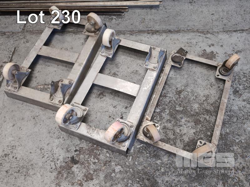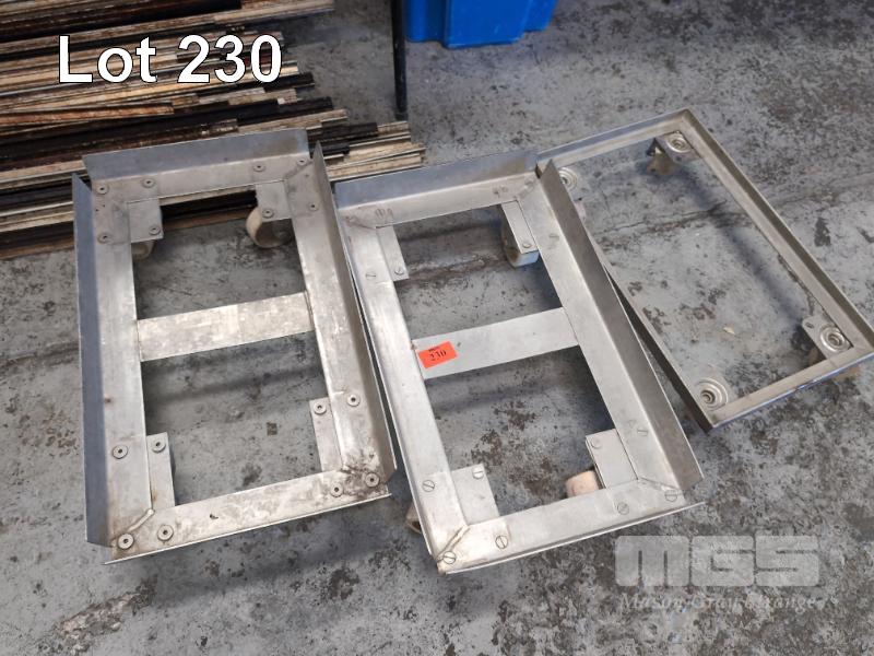 3 X STAINLESS STEEL HEAVY DUTY RECTANGULAR TUB TROLLEYS. ** ALL THREE MISSING A CASTOR WHEEL **