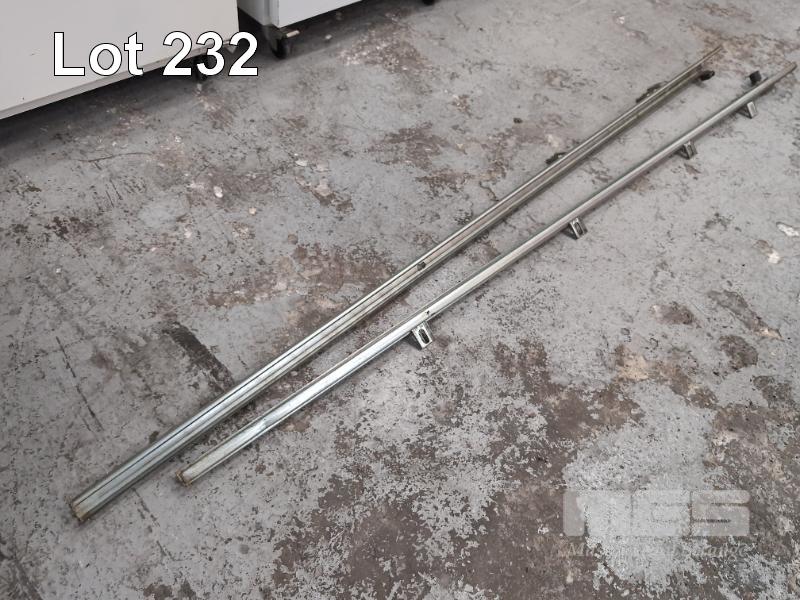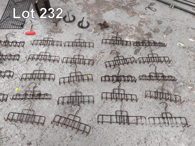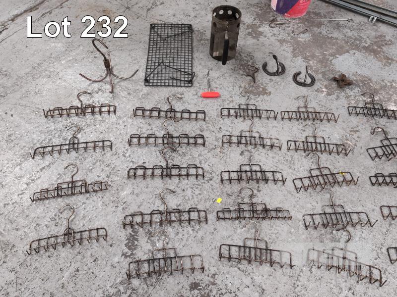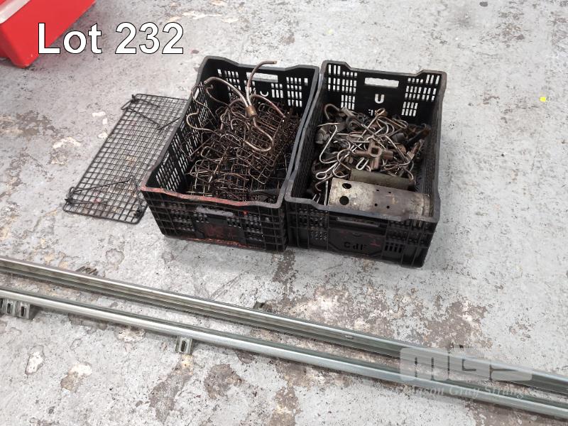 50 X ROLLER MEAT DRESSING HOOKS. 24 X BACON HANGERS. ASSORTED OTHER MEAT HOOKS. CONTENTS. LARGE 4-PRONGED STAINLESS STEEL BUTCHER'S HOOK. FIRE BUCKET. 2 X RUNNER RAILS. CONTENTS OF 2 X CRATES