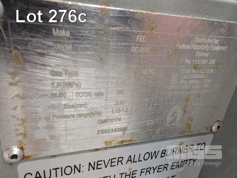 1 X FED FRYMAX FREESTANDING LPG DEEP FRYER. MODEL RC-500E. 540 X 770 X 1,400 MM (W D H). WITH COVER AND 3 X BASKETS