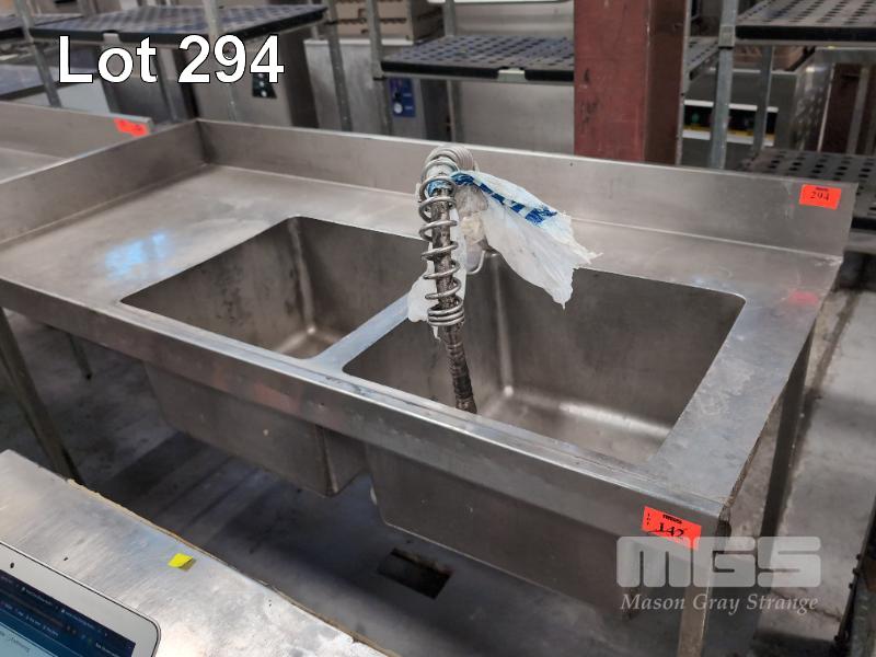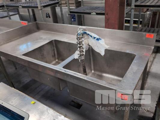 1 X STAINLESS STEEL DUAL SINK UNIT WITH LEFT HAND RETURN SPLASHBACK, UNDERSHELF AND RINSE TAP. 1,540 X 720 X 900 MM (W D H). ** CONDITION UNKNOWN **