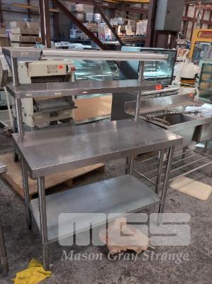 1 X STANLESS STEEL COMMERCIAL KITCHEN PREP BENCH WITH UNDERSHELF AND 2 X TOP SHELVES. BENCH 1,200 X 60 X 900 MM (W D H). TOP SHELVES 900 X 300 (W D).