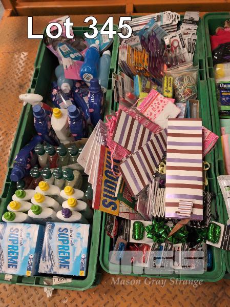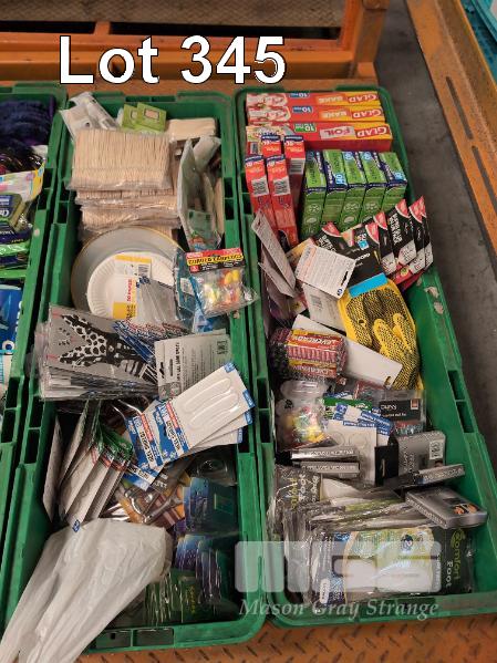 SELECTION OF CONVENIENCE STORE GROCERY STOCK. INCLOUDES ASSORTED HOUSEHOLD CLEANING SUPPLIES, STATIONARY & HARDWARE ETC. CONTENTS 5 X GREEN TUBS. GREEN TUBS NOT INCLUDED.