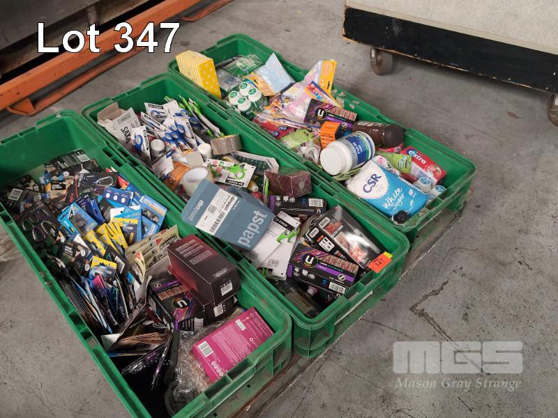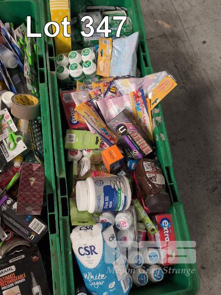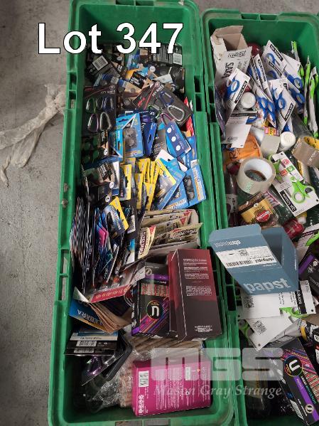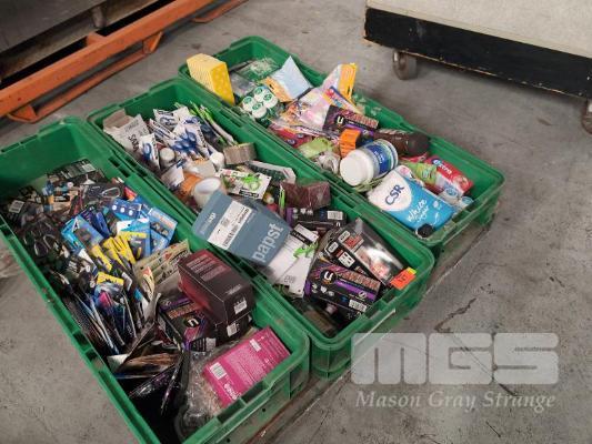 SELECTION OF CONVENIENCE STORE GROCERY STOCK. INCLUDES ASSORTED BATTERIES & HARDWARE, CHEWING GUMS, INSTANT COFFEE, OFFICE SUPPLIES ETC CONTENTS 3 X GREEN TUBS. GREEN TUBS NOT INCLUDED.