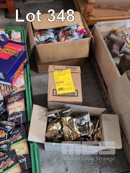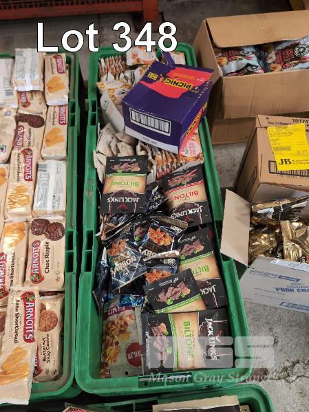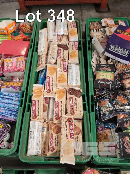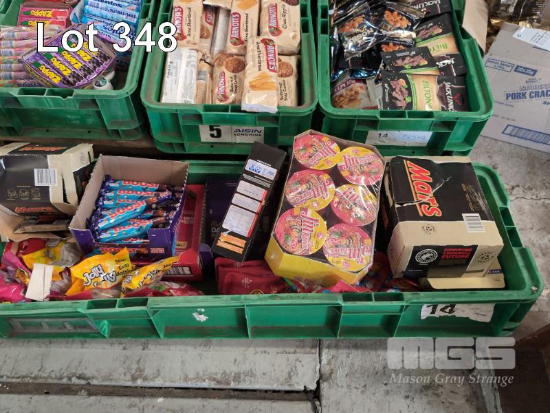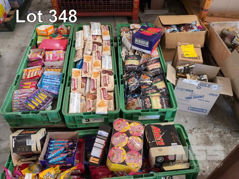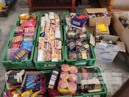 SELECTION OF CONVENIENCE STORE GROCERY STOCK. ASSORTED FOODSTUFFS INCLUDES BISCUITS, BEEF JERKY, CHOCOLATE BARS, CHEWING GUMS & LOLLIES ETC CONTENTS 4 X GREEN TUBS & 3 X CARONS. GREEN TUBS NOT INCLUDED.
