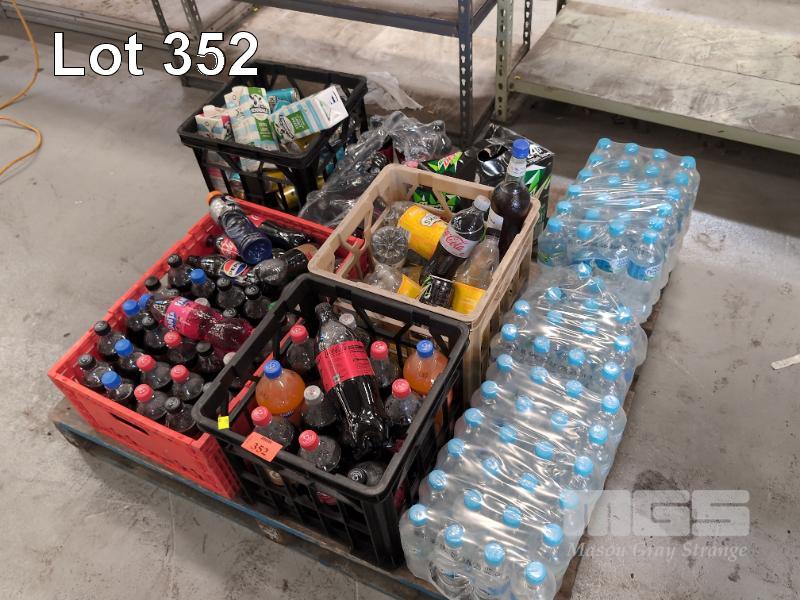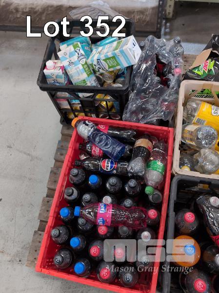 SELECTION OF CONVENIENCE STORE GROCERY STOCK. ASSORTED BEVERAGES. INCLUDES BOTTLED WATER, COKE, MOUNTAIN DEW, UHT MILK, KIRKS SOFTDRINKS ETC CONTENTS 1 X PALLET. CRATES NOT INCLUDED.