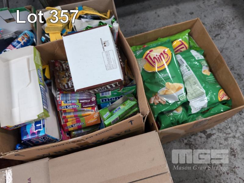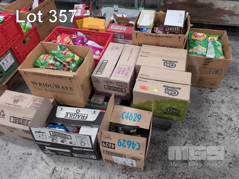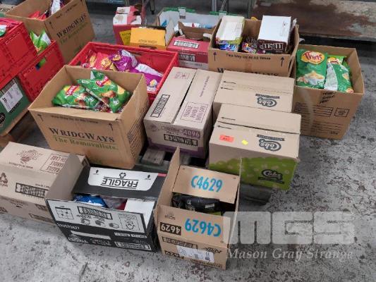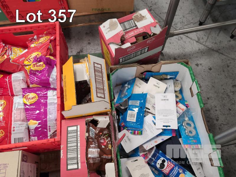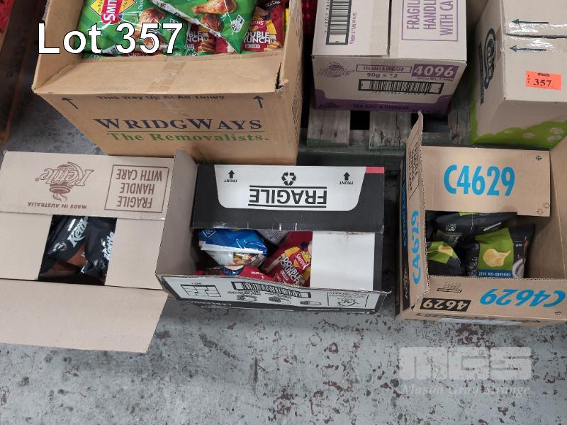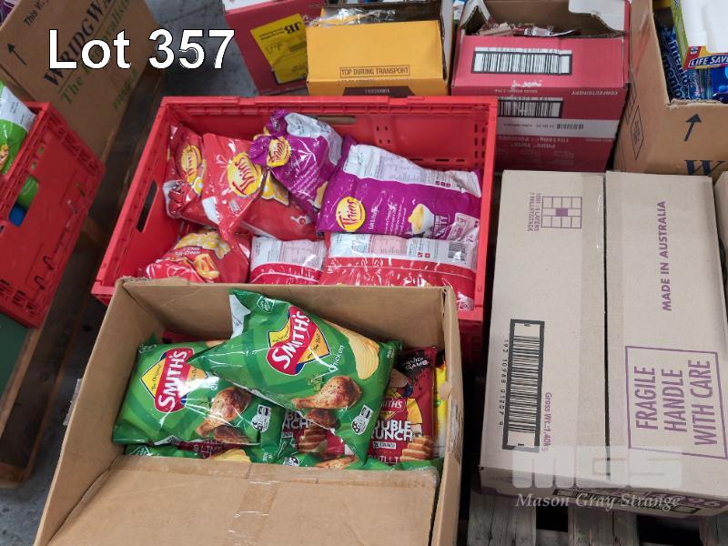 SELECTION OF CONVENIENCE STORE GROCERY STOCK. ASSORTED SNACKS. INCLUDES CHIPS, POPCORN, LOLLIES, CHOCOLATES, BIRTHDAY CANDLES ETC CONTENTS 1 X PALLET. CRATES NOT INCLUDED.