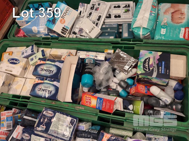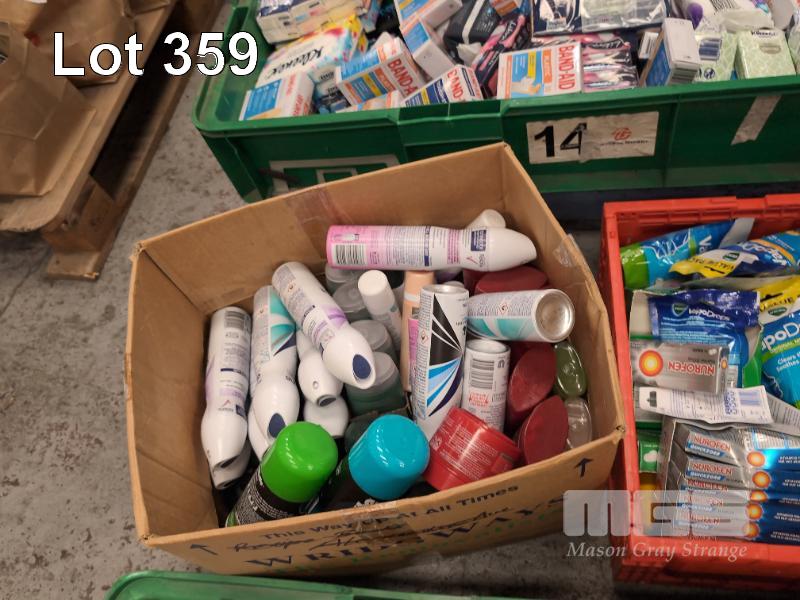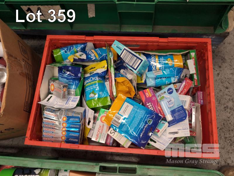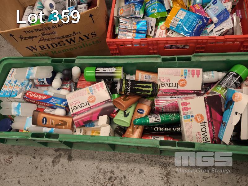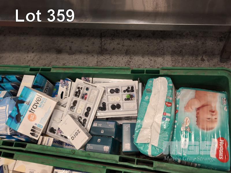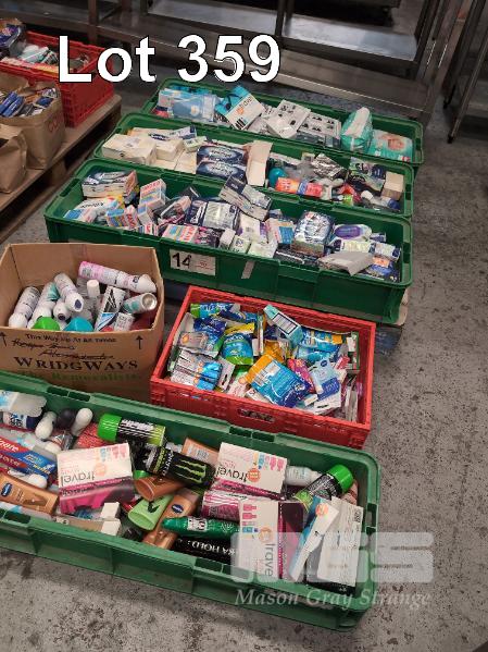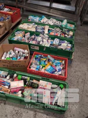 SELECTION OF CONVENIENCE STORE GROCERY STOCK. ASSORTED PERSONAL HYGIENE & HEALTH PRODUCTS. INCLUDES SHAMPOOS, DEODERANTS, TOOTHPASTE & TOOTHBRUSHES, BANDAIDS, TISSUES, NAPPIES, FEMININE HYGIENE, ANALGESICS, BIRTH CONTROL PRODUCTS ETC. ALSO INSECT REPELLENT & SEWING. CONTENTS 7 X CRATES & 1 X CARTON. CRATES NOT INCLUDED.