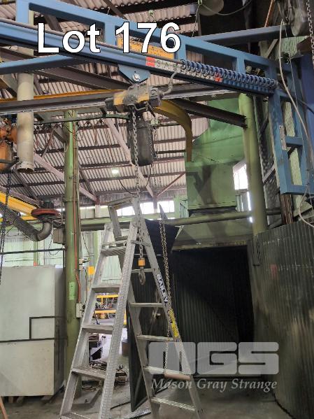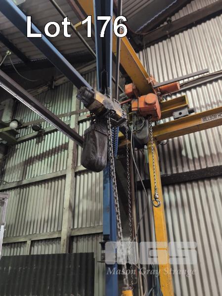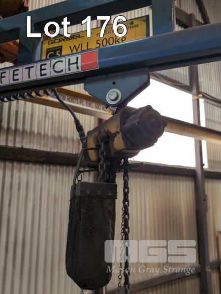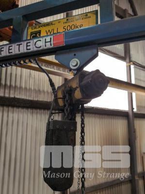 GORBEL ELECTRIC CHAIN LIFTING HOIST, 500kg CAPACITY, 415V, 3 PHASE ON SAFETECH STEEL POST JIB GANTRY