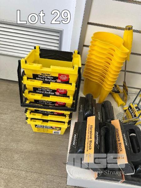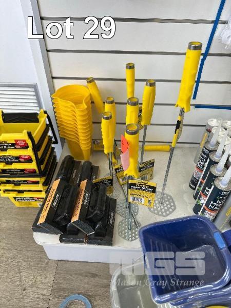 8 x HAND PAINT MIXERS, 7 x ABRASIVE BLOCKS & 11 x PLASTIC PAINT POTS