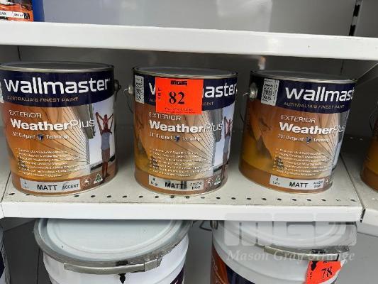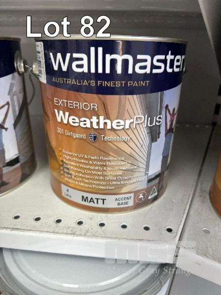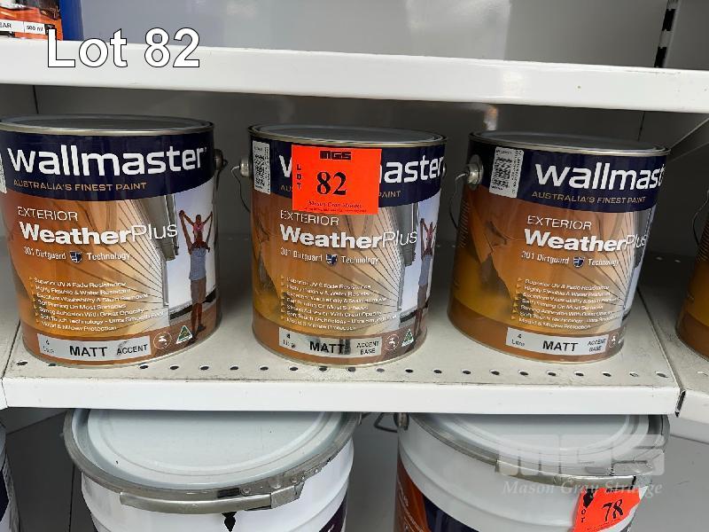 5 x TINS, WALLMASTER, 4 LITRE SUPERIOR WEATHER PLUS MATT ACCENT BASE