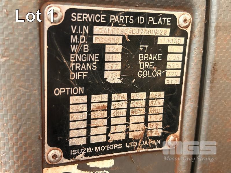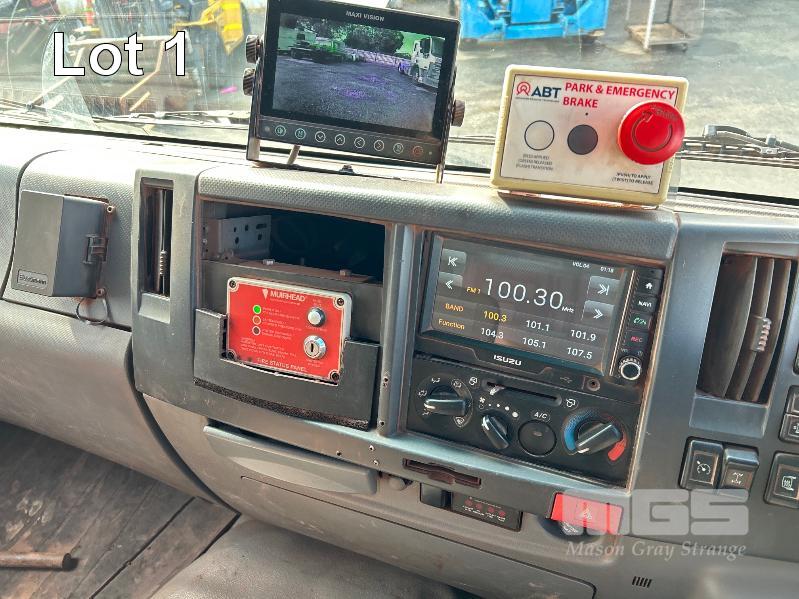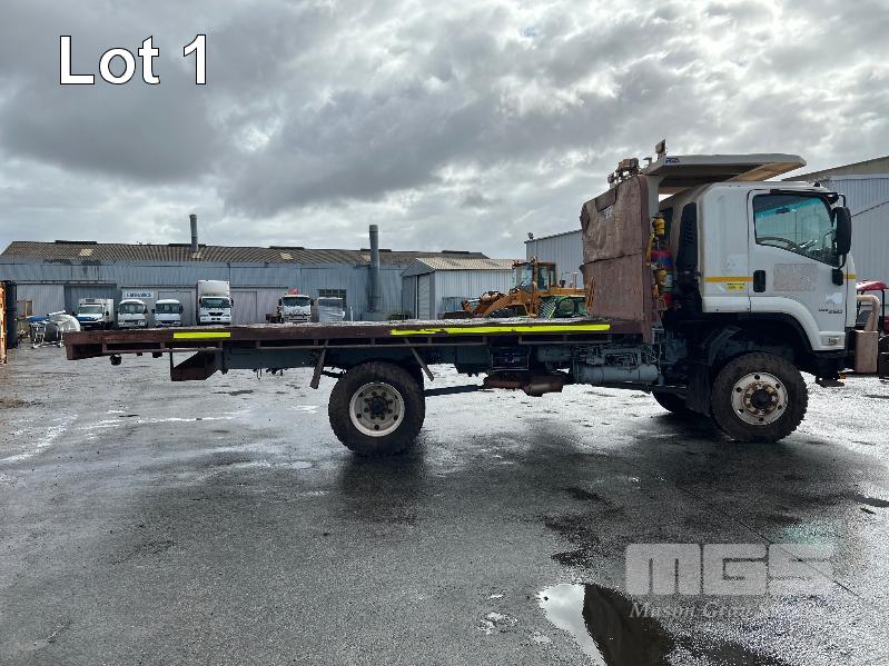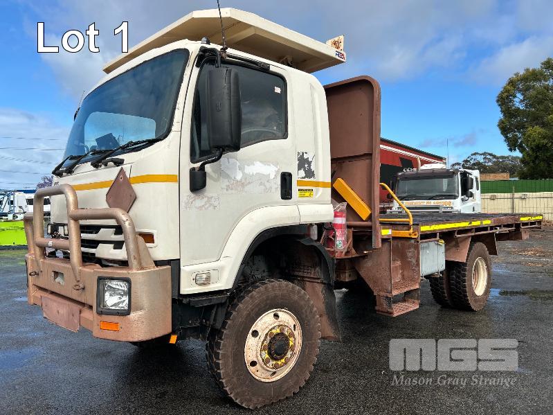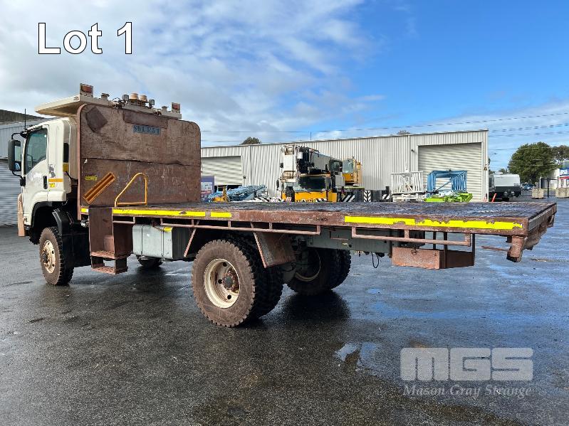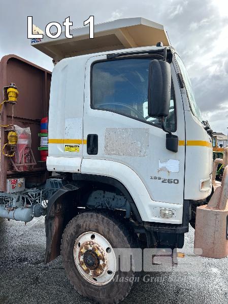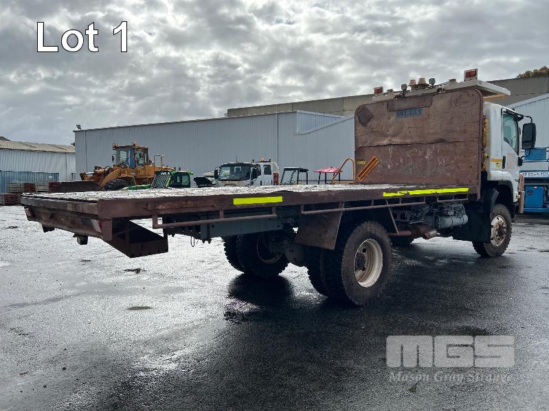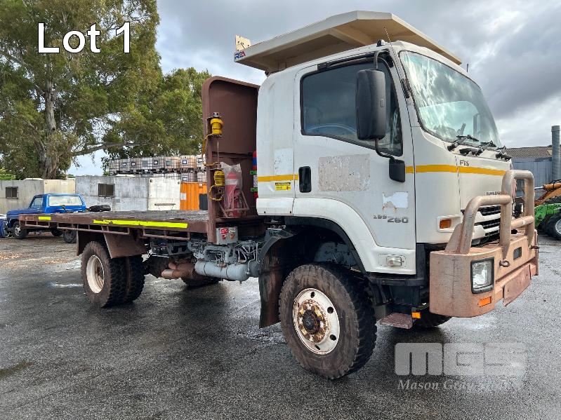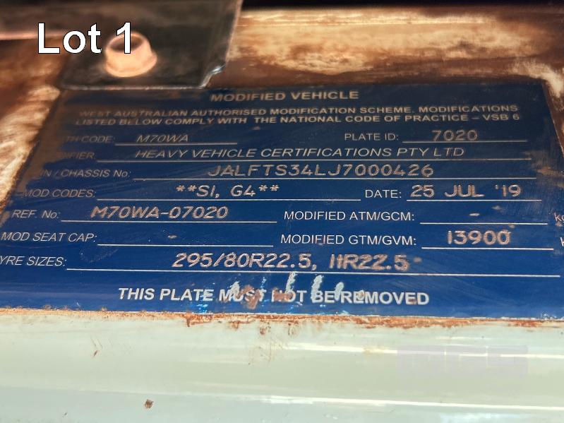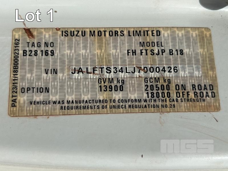 2019 ISUZU FH-FTS139-260 4x4 SINGLE CAB TRAYTOP TRUCK REG: NO PLATES VIN: JALFTS34LJ7000426 ODO: 58,155kms SHOWING GVM: 13,900kg GCM: 20,500kg 6 CYLINDER TURBO DIESEL, 6 SPEED MANUAL TRANSMISSION, SPRING SUSPENSION, WHITE DUCO, 11R 22.5 2 DOORS, 3 SEAT, AIR CON, BULL BAR, STEEL TRAY, MINE SPEC FIRE SUPPRESSION SYSTEM, MUIRHEAD BATTERY ISOLATION SWITCHES, REVERSE CAMERA & LCD, REA, ROPS & FOPS CANOPY OVER CAB WARNING LIGHTS, ABT EMERGENCY BRAKE SYSTEM TRAY SIZE 6000x2500mm FITTED WITH SIDE MOUNTED STEPS & 6 x CONTAINER LOCKING PINS KEY #7 (WITH 1 KEY/S)