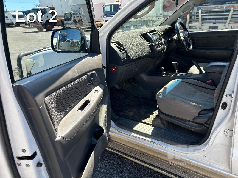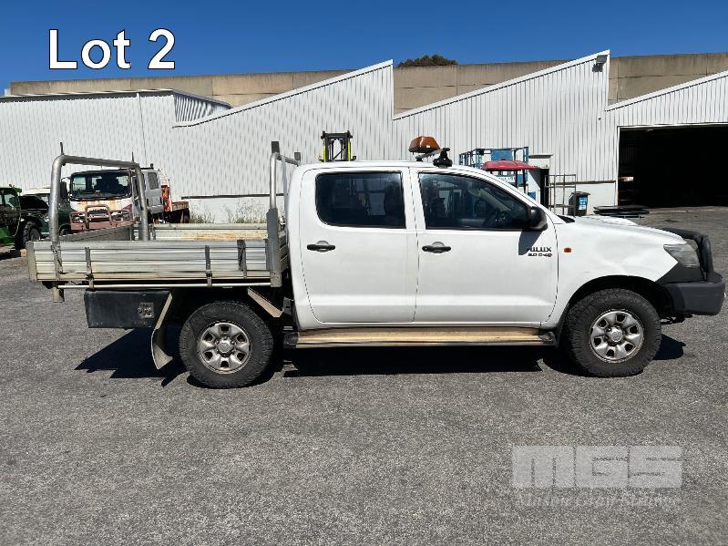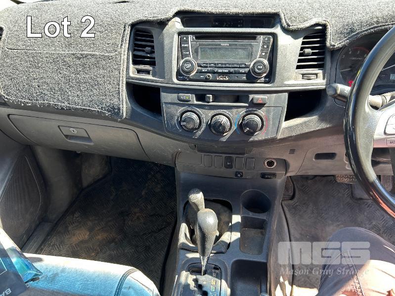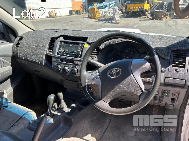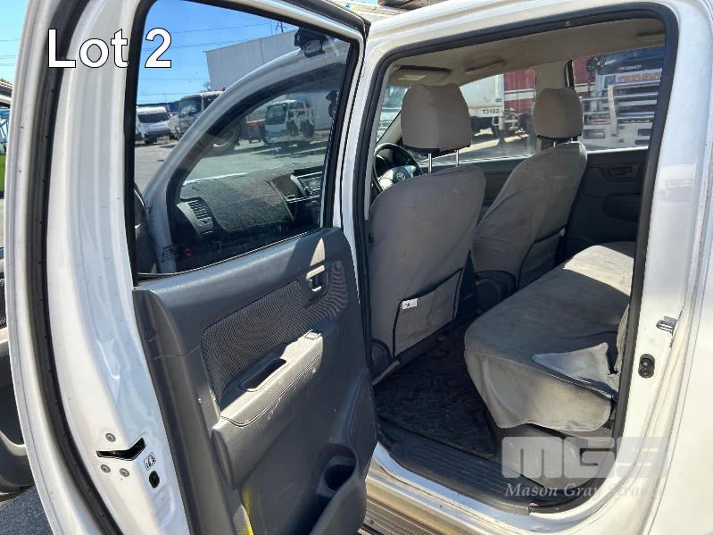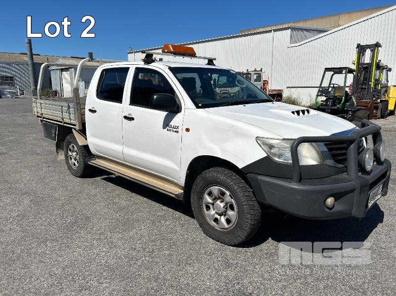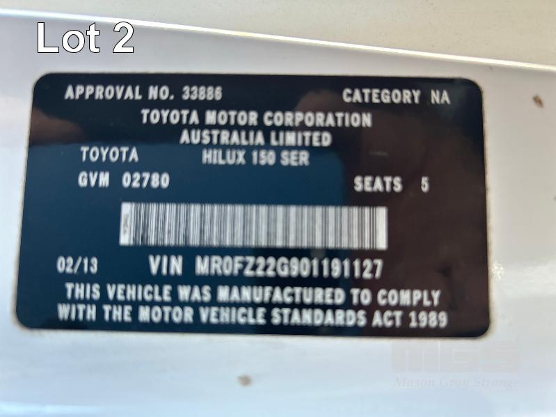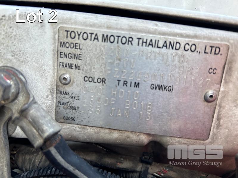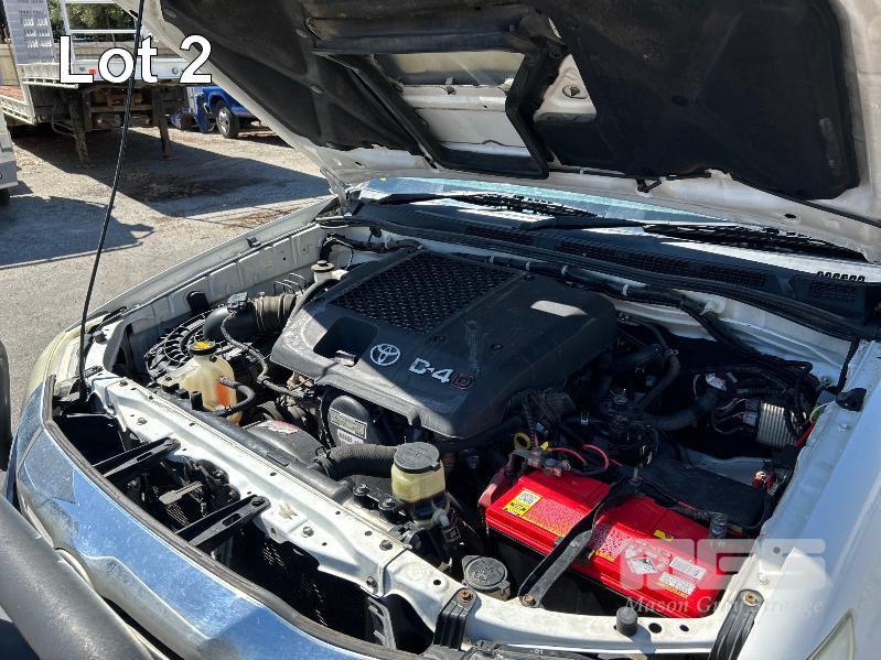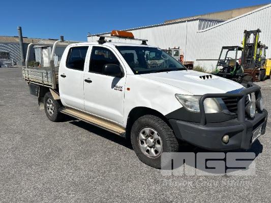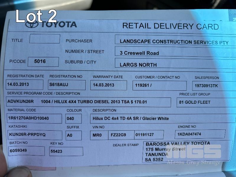 2013 TOYOTA HILUX KUN26R 150 SERIES DUAL CAB TRAY TOP 4x4 REG: S618 AUJ (SA) VIN: MR0FZ22G901191127 ENG: 1KDA047474 ODO: 332,780kms SHOWING 3.0 LITRE TURBO DIESEL, AUTOMATIC TRANSMISSION, WHITE DUCO, 4 DOORS, 5 SEAT, 4x4 ABS, AIR BAG, AIR CON, ALLOY TRAY, BULL BAR, CD PLAYER, CENTRAL LOCKING, CRUISE CONTROL, IMMOBILISER, LADDER RACK, POWER STEERING, ROOF RACKS, SPARE WHEEL, SPOT LIGHTS, TOW BAR, ROOF MOUNT WARNING LIGHTS UNDER TRAY TOOL BOXES KEY #32 (WITH 2 KEY/S, WITH OWNER'S MANUAL, WITH SERVICE BOOKS) CONDITION: BODY - DENTS & SCRATCHES