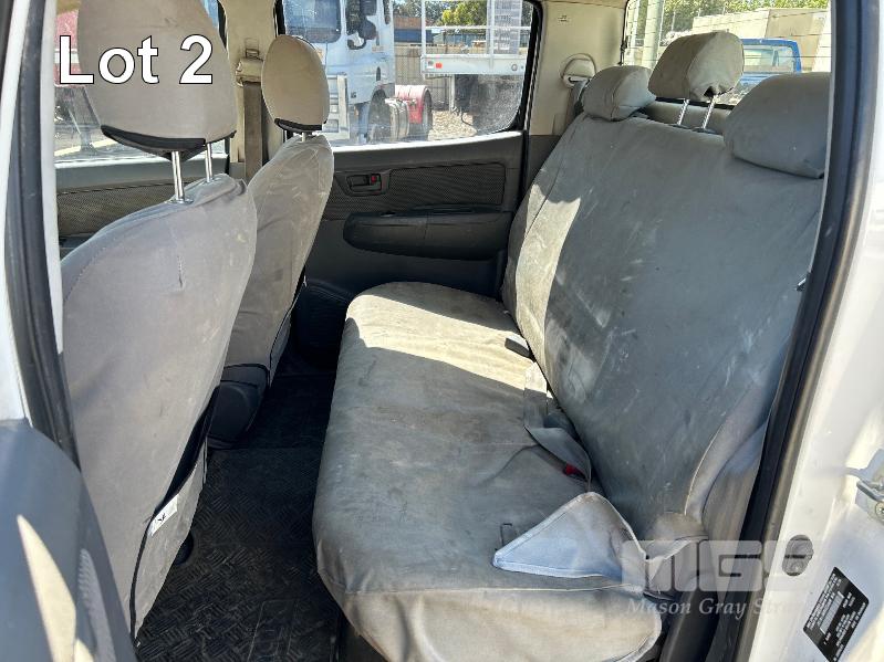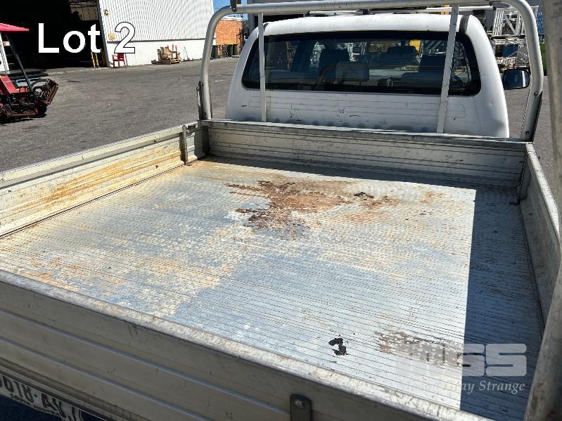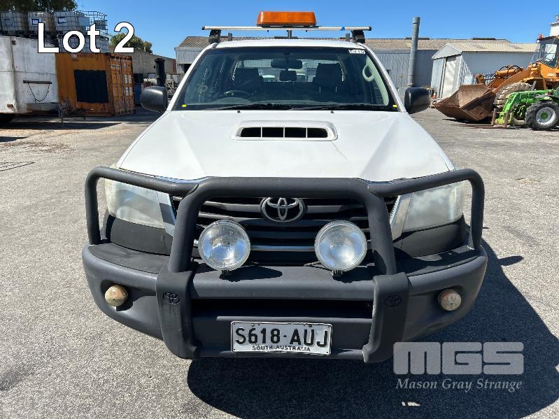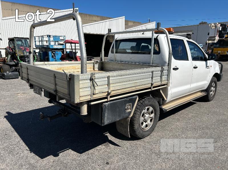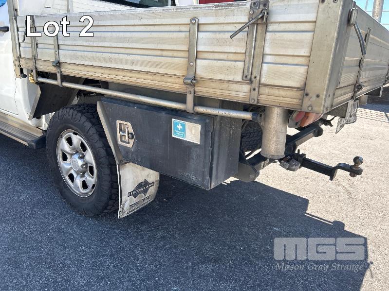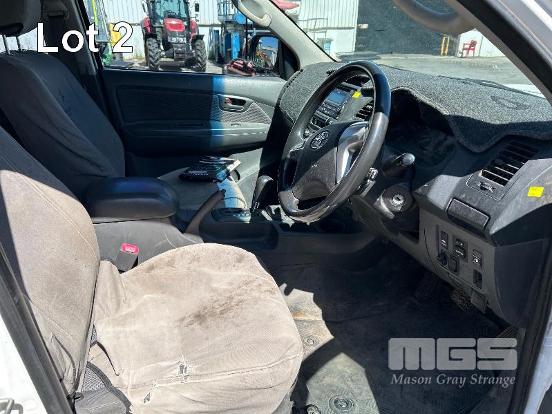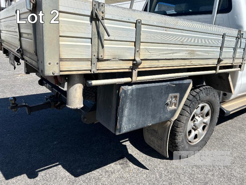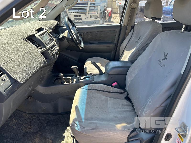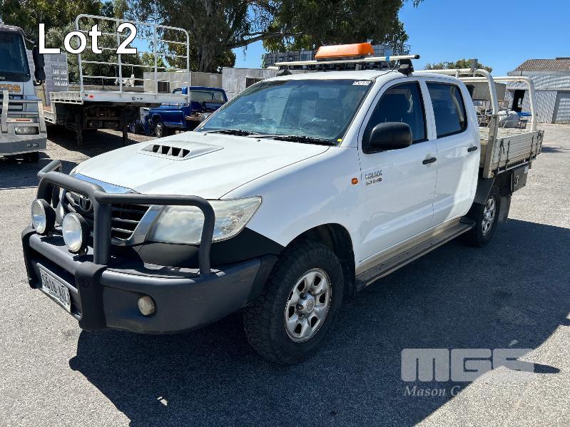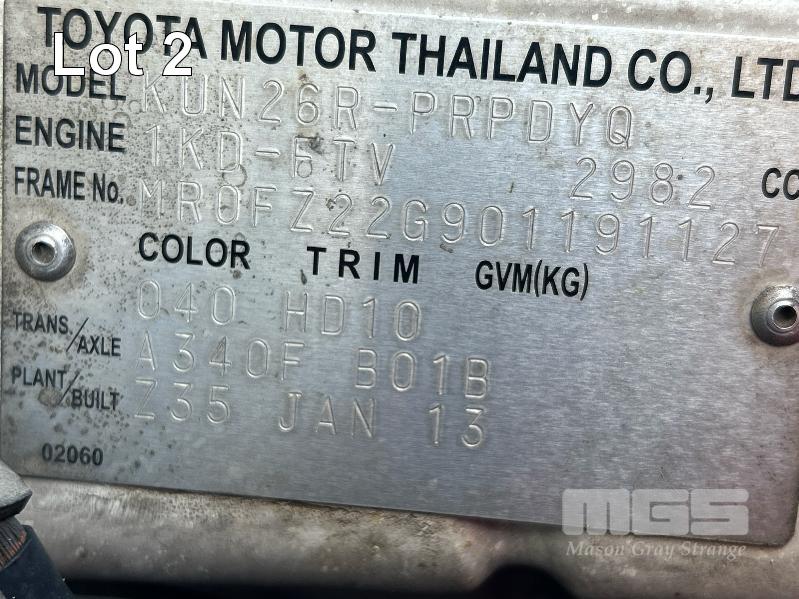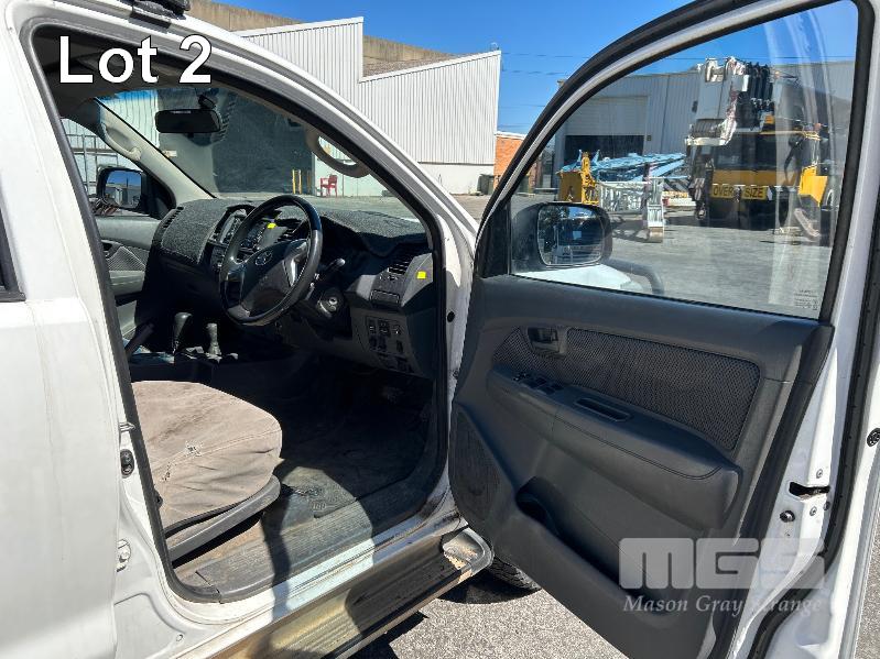 2013 TOYOTA HILUX KUN26R 150 SERIES DUAL CAB TRAY TOP 4x4 REG: S618 AUJ (SA) VIN: MR0FZ22G901191127 ENG: 1KDA047474 ODO: 332,780kms SHOWING 3.0 LITRE TURBO DIESEL, AUTOMATIC TRANSMISSION, WHITE DUCO, 4 DOORS, 5 SEAT, 4x4 ABS, AIR BAG, AIR CON, ALLOY TRAY, BULL BAR, CD PLAYER, CENTRAL LOCKING, CRUISE CONTROL, IMMOBILISER, LADDER RACK, POWER STEERING, ROOF RACKS, SPARE WHEEL, SPOT LIGHTS, TOW BAR, ROOF MOUNT WARNING LIGHTS UNDER TRAY TOOL BOXES KEY #32 (WITH 2 KEY/S, WITH OWNER'S MANUAL, WITH SERVICE BOOKS) CONDITION: BODY - DENTS & SCRATCHES
