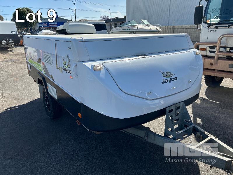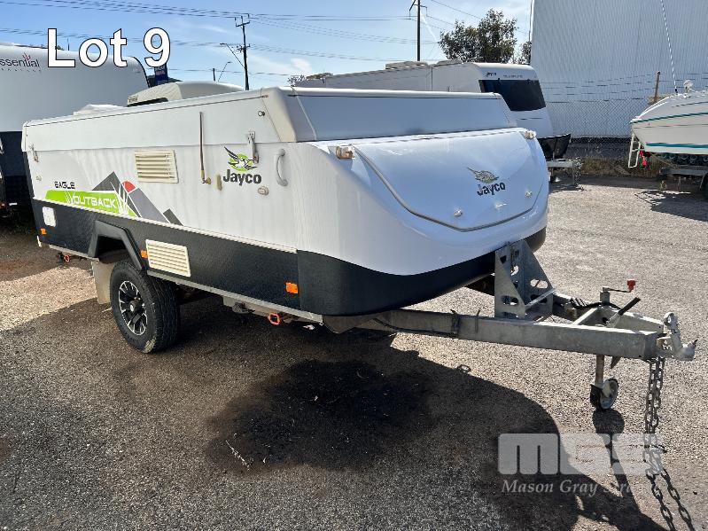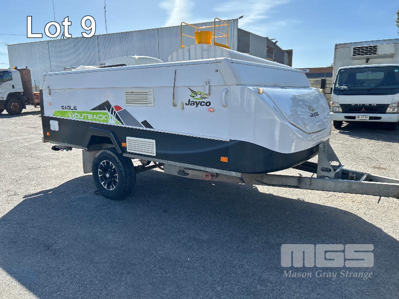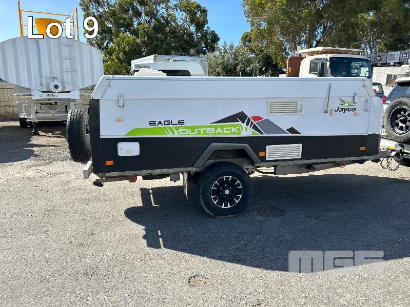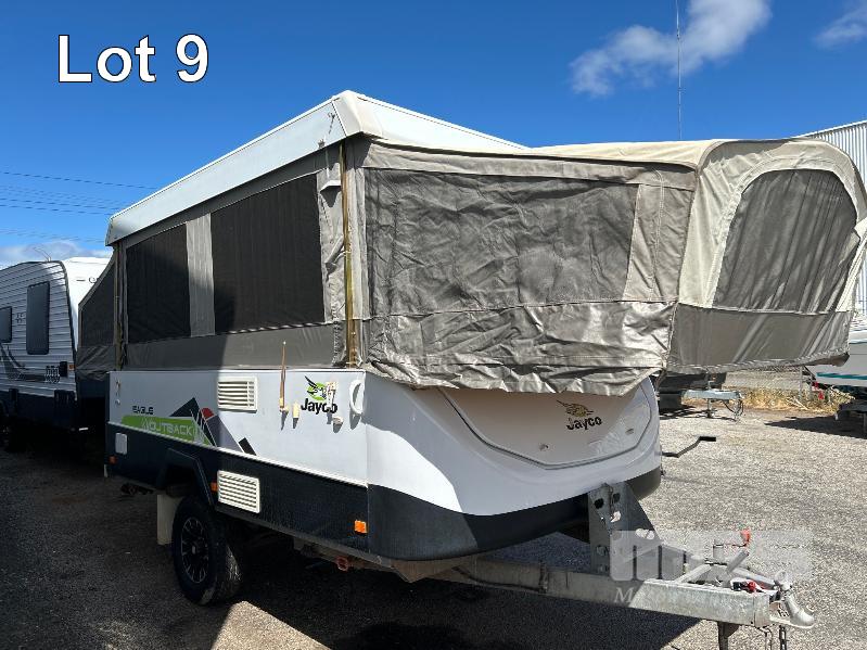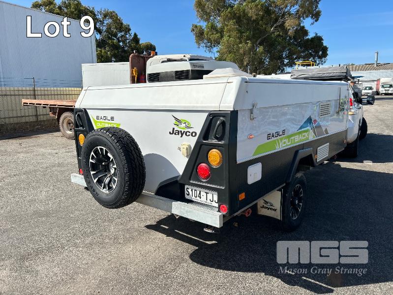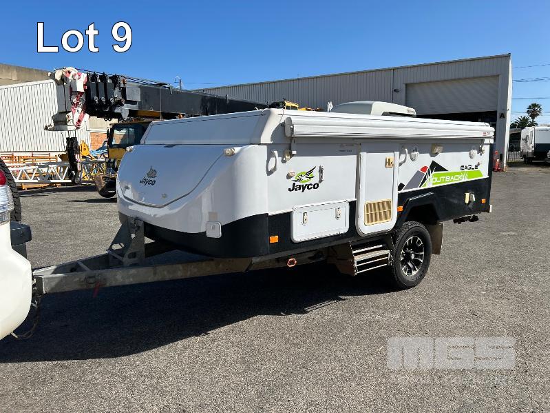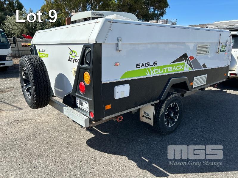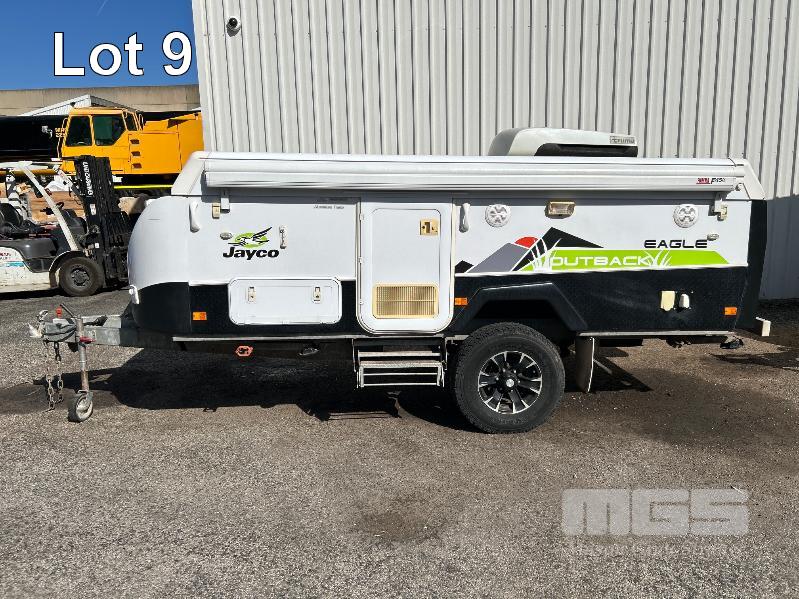2013 JAYCO EAGLE OUTBACK, 13 Ft POP TOP CARAVAN REG: S104 TJJ (SA) VIN: 6AM000000D1R16263 SINGLE AXLE, OFF ROAD WHITE/BLACK FINISH, SLEEPS 5 PEOPLE BALL HITCH, ELECTRIC BRAKES FULL KITCHEN INCLUDING COMETIC GAS/ELEC STOVE/GRILL, MICROWAVE, THETFORD 3 WAY FRIDGE TRUMA, ROOF MOUNT A/C UNIT, MODLE: AVENTA COMFORT STEREO SYSTEM, ROLL OUT AWNING, JERRY CAN HOLDER, SPARE WHEEL GTM: 1,222kg GCM: 1,522kg WITH REG PAPER & BOOKS KEY #11